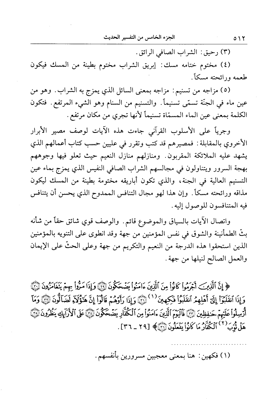 (5) مزاجه من تسنيم: مزاجه بمعنى السائل الذي يمزج به الشراب. وهو من عين ماء في الجنّة تسمّى تسنيما. والتسنيم من السنام وهو الشيء المرتفع. فتكون الكلمة بمعنى عين الماء المسمّاة تسنيما لأنها تجري من مكان مرتفع.