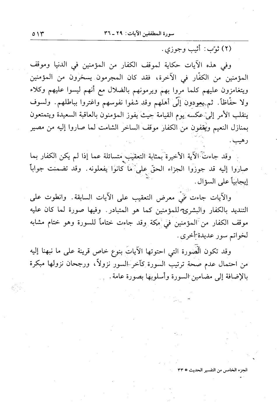 وفي هذه الآيات حكاية لموقف الكفار من المؤمنين في الدنيا وموقف المؤمنين من الكفّار في الآخرة، فقد كان المجرمون يسخرون من المؤمنين ويتغامزون عليهم كلما مروا بهم ويرمونهم بالضلال مع أنهم ليسوا عليهم وكلاء ولا حفّاظا. ثم يعودون إلى أهلهم وقد شفوا نفوسهم واغتروا بباطلهم. ولسوف ينقلب الأمر إلى عكسه يوم القيامة حيث يفوز المؤمنون بالعاقبة السعيدة ويتمتعون بمنازل النعيم ويقفون من الكفار موقف الساخر الشامت لما صاروا إليه من مصير رهيب.