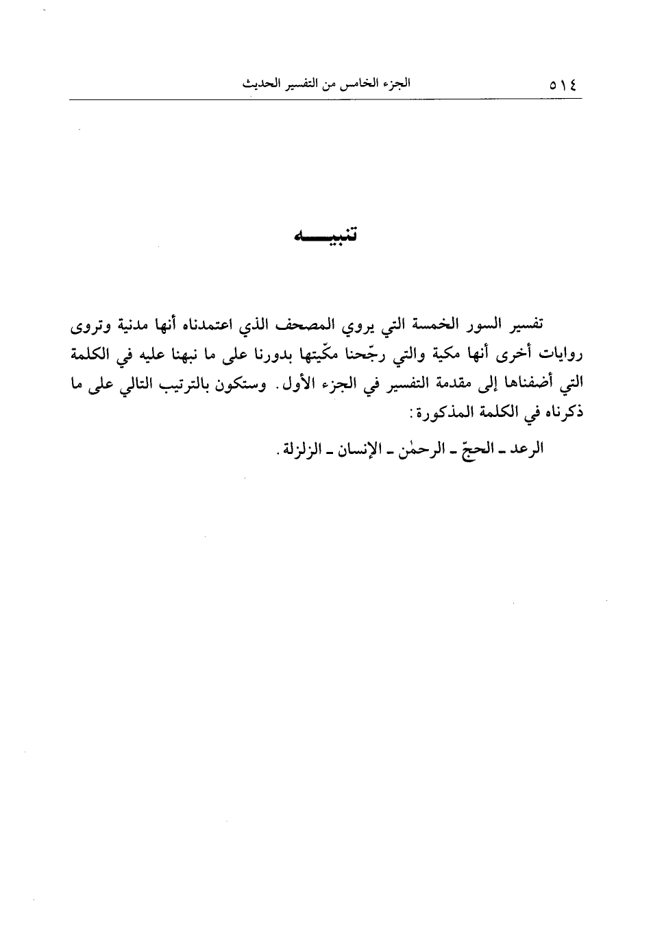 تفسير السور الخمسة التي يروي المصحف الذي اعتمدناه أنها مدنية وتروى روايات أخرى أنها مكية والتي رجّحنا مكّيتها بدورنا على ما نبهنا عليه في الكلمة التي أضفناها إلى مقدمة التفسير في الجزء الأول. وستكون بالترتيب التالي على ما ذكرناه في الكلمة المذكورة: