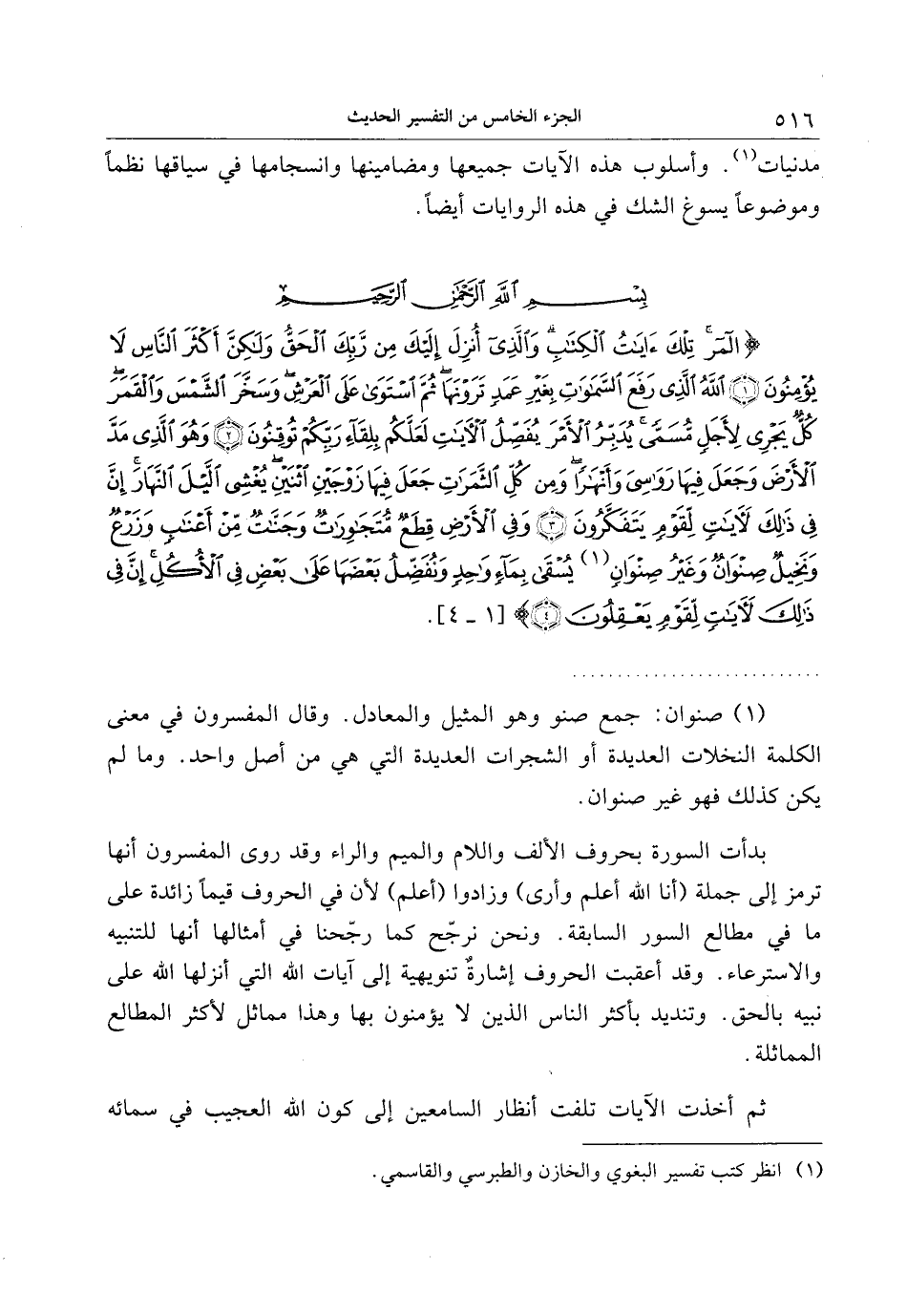 المر تِلْكَ آياتُ الْكِتابِ وَالَّذِي أُنْزِلَ إِلَيْكَ مِنْ رَبِّكَ الْحَقُّ وَلكِنَّ أَكْثَرَ النَّاسِ لا يُؤْمِنُونَ (1) اللَّهُ الَّذِي رَفَعَ السَّماواتِ بِغَيْرِ عَمَدٍ تَرَوْنَها ثُمَّ اسْتَوى عَلَى الْعَرْشِ وَسَخَّرَ الشَّمْسَ وَالْقَمَرَ كُلٌّ يَجْرِي لِأَجَلٍ مُسَمًّى يُدَبِّرُ الْأَمْرَ يُفَصِّلُ الْآياتِ لَعَلَّكُمْ بِلِقاءِ رَبِّكُمْ تُوقِنُونَ (2) وَهُوَ الَّذِي مَدَّ الْأَرْضَ وَجَعَلَ فِيها رَواسِيَ وَأَنْهاراً وَمِنْ كُلِّ الثَّمَراتِ جَعَلَ فِيها زَوْجَيْنِ اثْنَيْنِ يُغْشِي اللَّيْلَ النَّهارَ إِنَّ فِي ذلِكَ لَآياتٍ لِقَوْمٍ يَتَفَكَّرُونَ (3) وَفِي الْأَرْضِ قِطَعٌ مُتَجاوِراتٌ وَجَنَّاتٌ مِنْ أَعْنابٍ وَزَرْعٌ وَنَخِيلٌ صِنْوانٌ وَغَيْرُ صِنْوانٍ يُسْقى بِماءٍ واحِدٍ وَنُفَضِّلُ بَعْضَها عَلى بَعْضٍ فِي الْأُكُلِ إِنَّ فِي ذلِكَ لَآياتٍ لِقَوْمٍ يَعْقِلُونَ (4)