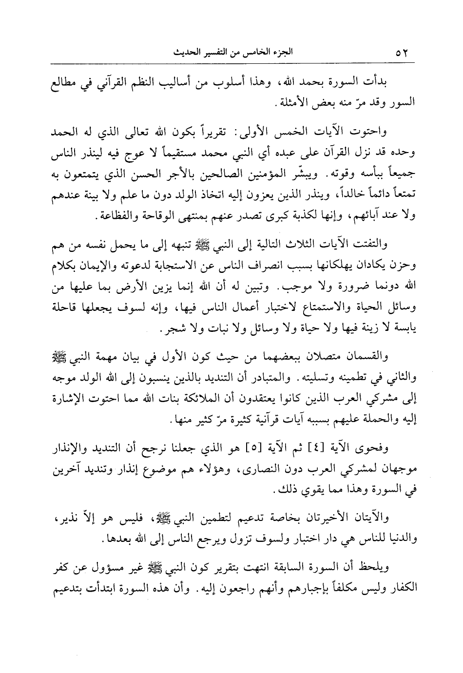 واحتوت الآيات الخمس الأولى: تقريرا بكون الله تعالى الذي له الحمد وحده قد نزل القرآن على عبده أي النبي محمد مستقيما لا عوج فيه لينذر الناس جميعا ببأسه وقوته. ويبشّر المؤمنين الصالحين بالأجر الحسن الذي يتمتعون به تمتعا دائما خالدا، وينذر الذين يعزون إليه اتخاذ الولد دون ما علم ولا بينة عندهم ولا عند آبائهم، وإنها لكذبة كبرى تصدر عنهم بمنتهى الوقاحة والفظاعة.