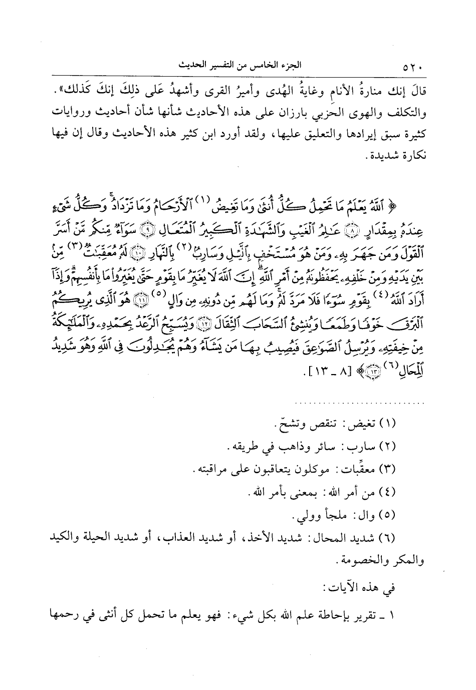 اللَّهُ يَعْلَمُ ما تَحْمِلُ كُلُّ أُنْثى وَما تَغِيضُ الْأَرْحامُ وَما تَزْدادُ وَكُلُّ شَيْءٍ عِنْدَهُ بِمِقْدارٍ (8) عالِمُ الْغَيْبِ وَالشَّهادَةِ الْكَبِيرُ الْمُتَعالِ (9) سَواءٌ مِنْكُمْ مَنْ أَسَرَّ الْقَوْلَ وَمَنْ جَهَرَ بِهِ وَمَنْ هُوَ مُسْتَخْفٍ بِاللَّيْلِ وَسارِبٌ بِالنَّهارِ (10) لَهُ مُعَقِّباتٌ مِنْ بَيْنِ يَدَيْهِ وَمِنْ خَلْفِهِ يَحْفَظُونَهُ مِنْ أَمْرِ اللَّهِ إِنَّ اللَّهَ لا يُغَيِّرُ ما بِقَوْمٍ حَتَّى يُغَيِّرُوا ما بِأَنْفُسِهِمْ وَإِذا أَرادَ اللَّهُ بِقَوْمٍ سُوْءاً فَلا مَرَدَّ لَهُ وَما لَهُمْ مِنْ دُونِهِ مِنْ والٍ (11) هُوَ الَّذِي يُرِيكُمُ الْبَرْقَ خَوْفاً وَطَمَعاً وَيُنْشِئُ السَّحابَ الثِّقالَ (12)