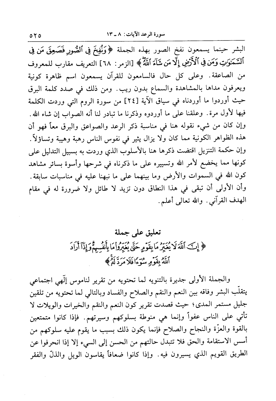 تعليق على جملة إِنَّ اللَّهَ لا يُغَيِّرُ ما بِقَوْمٍ حَتَّى يُغَيِّرُوا ما بِأَنْفُسِهِمْ وَإِذا أَرادَ اللَّهُ بِقَوْمٍ سُوْءاً فَلا مَرَدَّ لَهُ