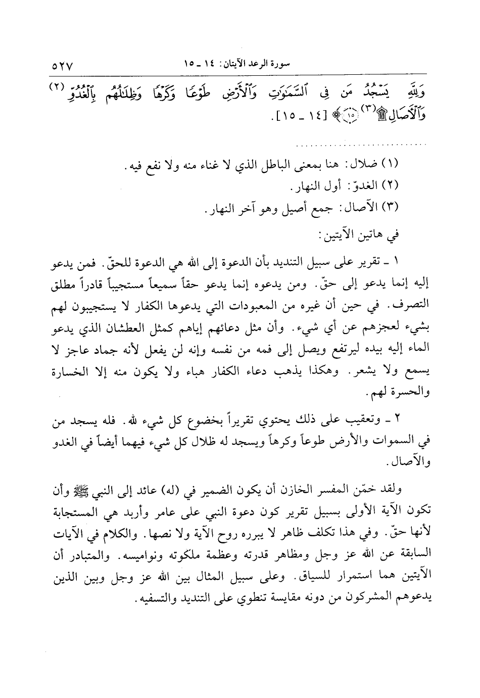2- وتعقيب على ذلك يحتوي تقريرا بخضوع كل شيء لله. فله يسجد من في السموات والأرض طوعا وكرها ويسجد له ظلال كل شيء فيهما أيضا في الغدو والآصال.