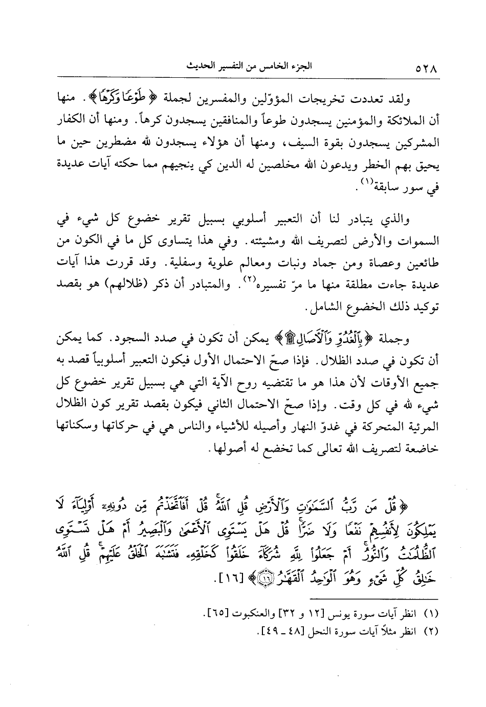 وجملة بِالْغُدُوِّ وَالْآصالِ يمكن أن تكون في صدد السجود. كما يمكن أن تكون في صدد الظلال. فإذا صحّ الاحتمال الأول فيكون التعبير أسلوبيا قصد به جميع الأوقات لأن هذا هو ما تقتضيه روح الآية التي هي بسبيل تقرير خضوع كل شيء لله في كل وقت. وإذا صحّ الاحتمال الثاني فيكون بقصد تقرير كون الظلال المرئية المتحركة في غدوّ النهار وأصيله للأشياء والناس هي في حركاتها وسكناتها خاضعة لتصريف الله تعالى كما تخضع له أصولها.
