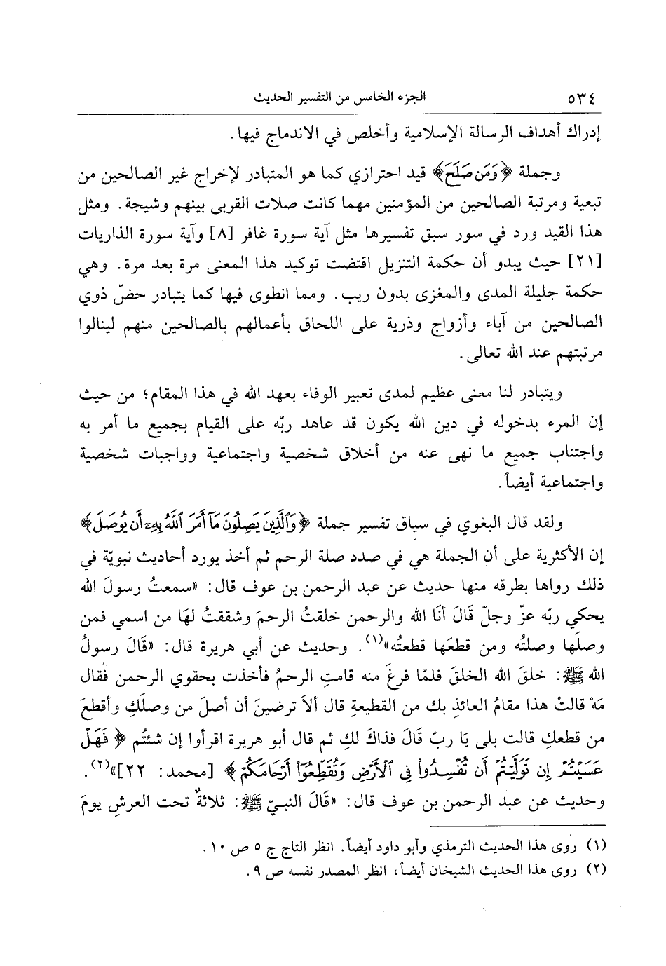 ولقد قال البغوي في سياق تفسير جملة وَالَّذِينَ يَصِلُونَ ما أَمَرَ اللَّهُ بِهِ أَنْ يُوصَلَ إن الأكثرية على أن الجملة هي في صدد صلة الرحم ثم أخذ يورد أحاديث نبويّة في ذلك رواها بطرقه منها حديث عن عبد الرّحمن بن عوف قال: «سمعت رسول الله يحكي ربّه عزّ وجلّ قال أنا الله والرّحمن خلقت الرحم وشققت لها من اسمي فمن وصلها وصلته ومن قطعها قطعته» «1» . وحديث عن أبي هريرة قال: «قال رسول الله صلى الله عليه وسلم: خلق الله الخلق فلمّا فرغ منه قامت الرحم فأخذت بحقوي الرّحمن فقال مه قالت هذا مقام العائذ بك من القطيعة قال ألا ترضين أن أصل من وصلك وأقطع من قطعك قالت بلى يا ربّ قال فذاك لك ثم قال أبو هريرة اقرأوا إن شئتم فَهَلْ عَسَيْتُمْ إِنْ تَوَلَّيْتُمْ أَنْ تُفْسِدُوا فِي الْأَرْضِ وَتُقَطِّعُوا أَرْحامَكُمْ [محمد: 22] » «2» .