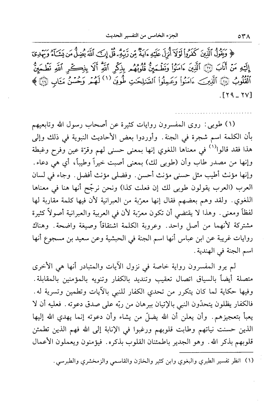 . (1) طوبى: روى المفسرون روايات كثيرة عن أصحاب رسول الله وتابعيهم بأن الكلمة اسم شجرة في الجنة. وأوردوا بعض الأحاديث النبوية في ذلك وإلى هذا فقد قالوا «1» في معناها اللغوي إنها بمعنى حسنى لهم وقرّة عين وفرح وغبطة وإنها من مصدر طاب وأن (طوبى لك) بمعنى أصبت خيرا وطيبا، أي هي دعاء.