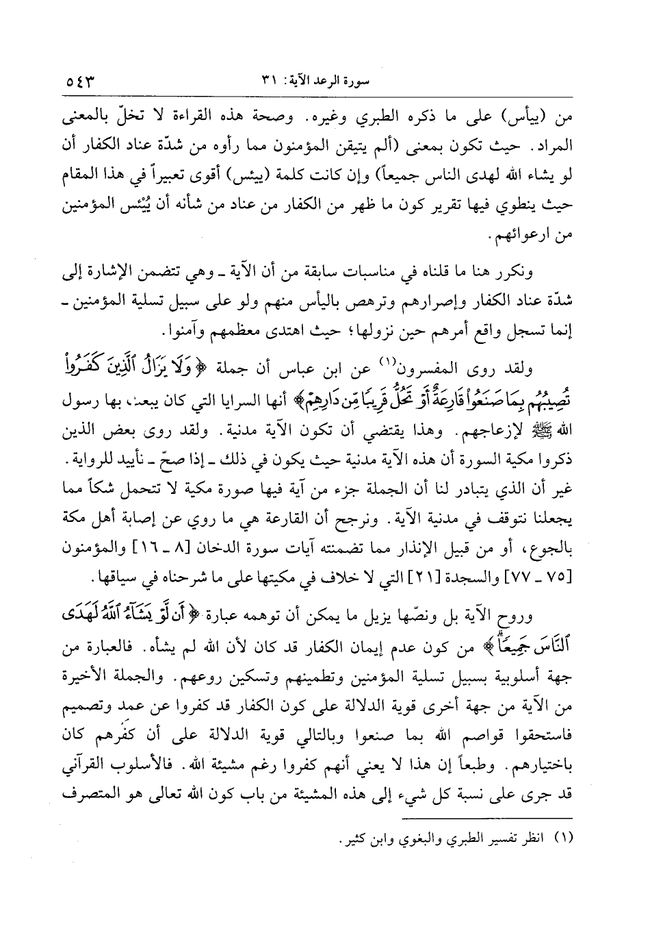 وروح الآية بل ونصّها يزيل ما يمكن أن توهمه عبارة أَنْ لَوْ يَشاءُ اللَّهُ لَهَدَى النَّاسَ جَمِيعاً من كون عدم إيمان الكفار قد كان لأن الله لم يشأه. فالعبارة من جهة أسلوبية بسبيل تسلية المؤمنين وتطمينهم وتسكين روعهم. والجملة الأخيرة من الآية من جهة أخرى قوية الدلالة على كون الكفار قد كفروا عن عمد وتصميم فاستحقوا قواصم الله بما صنعوا وبالتالي قوية الدلالة على أن كفرهم كان باختيارهم. وطبعا إن هذا لا يعني أنهم كفروا رغم مشيئة الله. فالأسلوب القرآني قد جرى على نسبة كل شيء إلى هذه المشيئة من باب كون الله تعالى هو المتصرف
