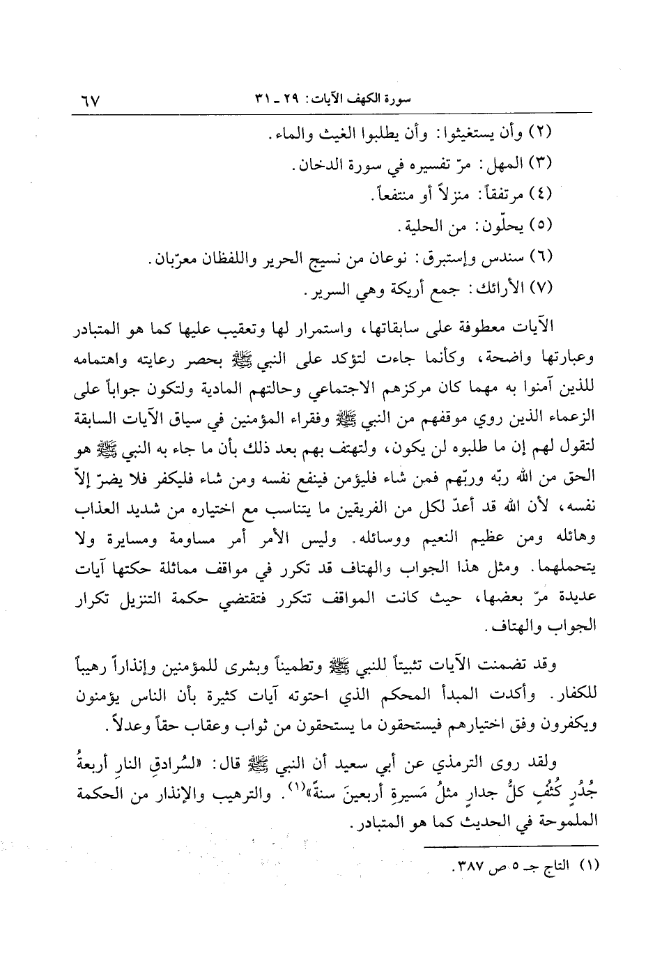 ولقد روى الترمذي عن أبي سعيد أن النبي صلى الله عليه وسلم قال: «لسرادق النار أربعة جدر كثف كلّ جدار مثل مسيرة أربعين سنة» «1» . والترهيب والإنذار من الحكمة الملموحة في الحديث كما هو المتبادر.