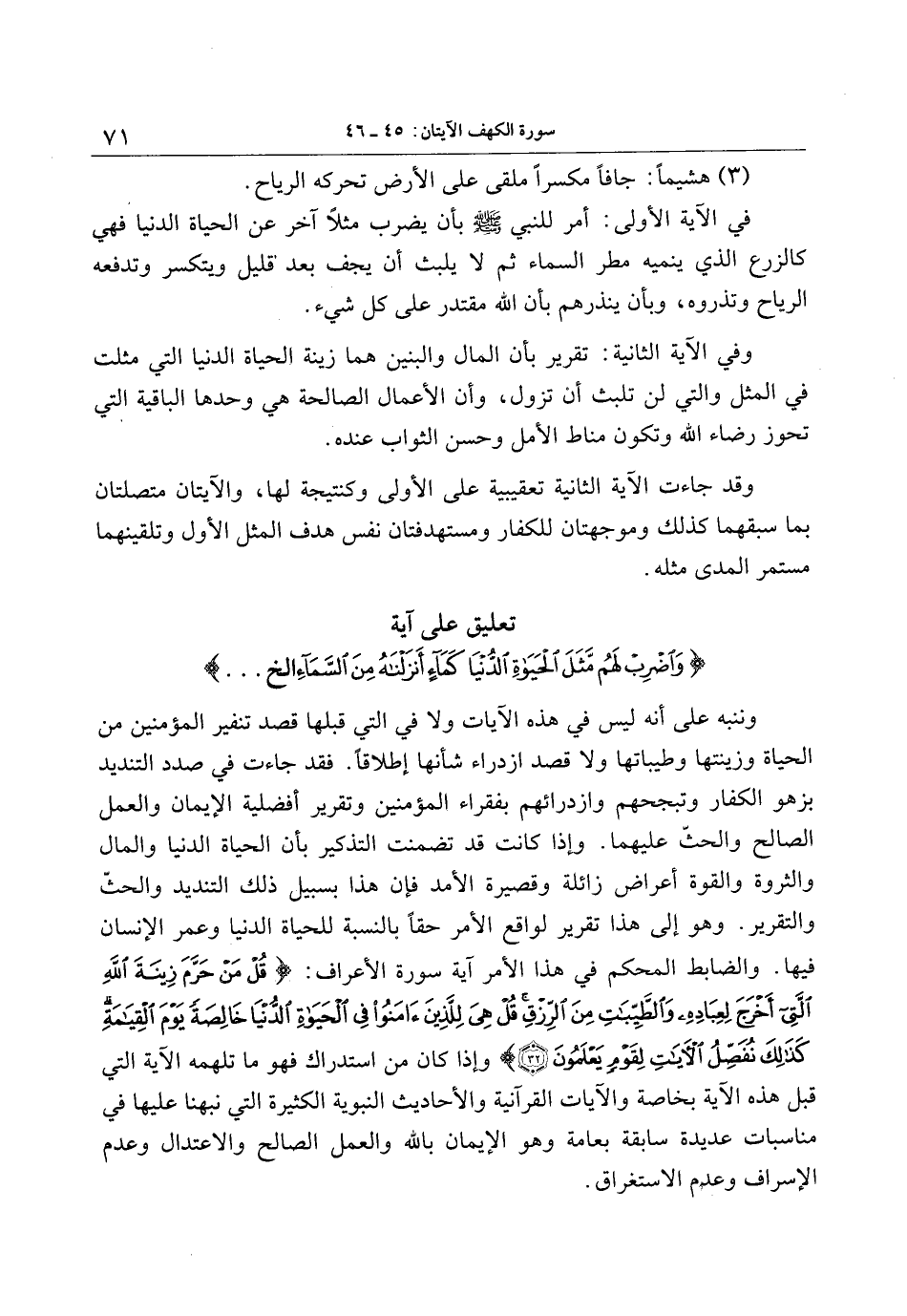 وننبه على أنه ليس في هذه الآيات ولا في التي قبلها قصد تنفير المؤمنين من الحياة وزينتها وطيباتها ولا قصد ازدراء شأنها إطلاقا. فقد جاءت في صدد التنديد بزهو الكفار وتبجحهم وازدرائهم بفقراء المؤمنين وتقرير أفضلية الإيمان والعمل الصالح والحثّ عليهما. وإذا كانت قد تضمنت التذكير بأن الحياة الدنيا والمال والثروة والقوة أعراض زائلة وقصيرة الأمد فإن هذا بسبيل ذلك التنديد والحثّ والتقرير. وهو إلى هذا تقرير لواقع الأمر حقا بالنسبة للحياة الدنيا وعمر الإنسان فيها. والضابط المحكم في هذا الأمر آية سورة الأعراف: قُلْ مَنْ حَرَّمَ زِينَةَ اللَّهِ الَّتِي أَخْرَجَ لِعِبادِهِ وَالطَّيِّباتِ مِنَ الرِّزْقِ قُلْ هِيَ لِلَّذِينَ آمَنُوا فِي الْحَياةِ الدُّنْيا خالِصَةً يَوْمَ الْقِيامَةِ كَذلِكَ نُفَصِّلُ الْآياتِ لِقَوْمٍ يَعْلَمُونَ (32) وإذا كان من استدراك فهو ما تلهمه الآية التي قبل هذه الآية بخاصة والآيات القرآنية والأحاديث النبوية الكثيرة التي نبهنا عليها في مناسبات عديدة سابقة بعامة وهو الإيمان بالله والعمل الصالح والاعتدال وعدم الإسراف وعدم الاستغراق.