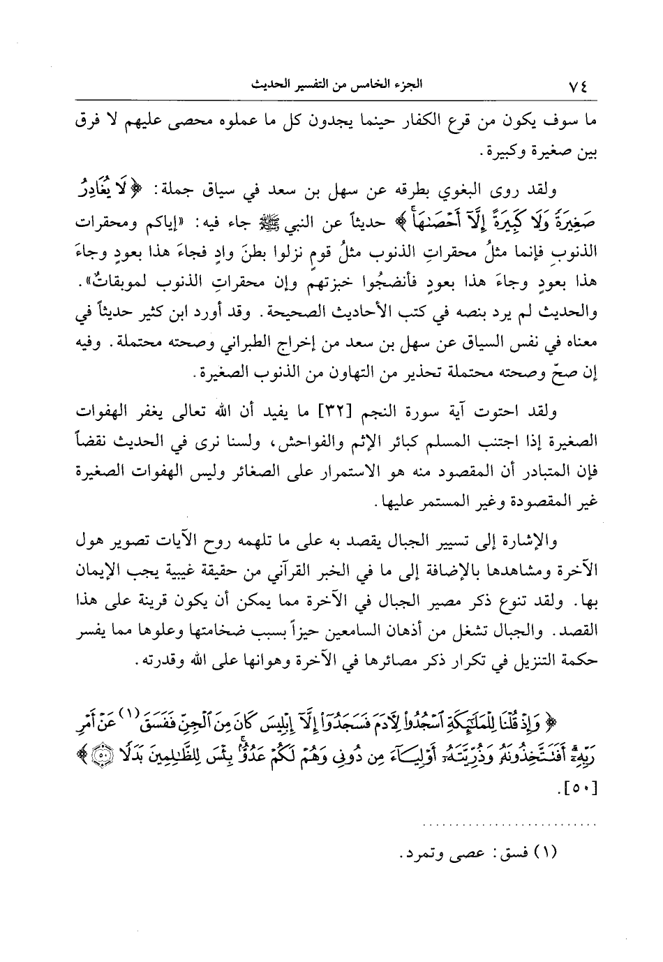 ولقد روى البغوي بطرقه عن سهل بن سعد في سياق جملة: لا يُغادِرُ صَغِيرَةً وَلا كَبِيرَةً إِلَّا أَحْصاها حديثا عن النبي صلى الله عليه وسلم جاء فيه: «إياكم ومحقرات الذنوب فإنما مثل محقرات الذنوب مثل قوم نزلوا بطن واد فجاء هذا بعود وجاء هذا بعود وجاء هذا بعود فأنضجوا خبزتهم وإن محقرات الذنوب لموبقات» .