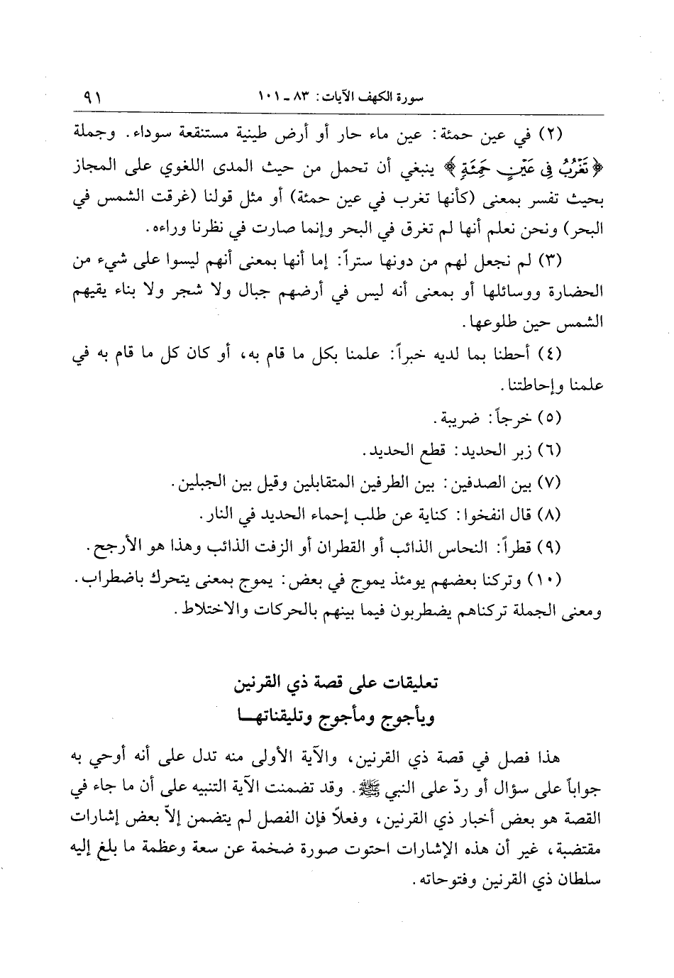 (2) في عين حمئة: عين ماء حار أو أرض طينية مستنقعة سوداء. وجملة تَغْرُبُ فِي عَيْنٍ حَمِئَةٍ ينبغي أن تحمل من حيث المدى اللغوي على المجاز بحيث تفسر بمعنى (كأنها تغرب في عين حمئة) أو مثل قولنا (غرقت الشمس في البحر) ونحن نعلم أنها لم تغرق في البحر وإنما صارت في نظرنا وراءه.