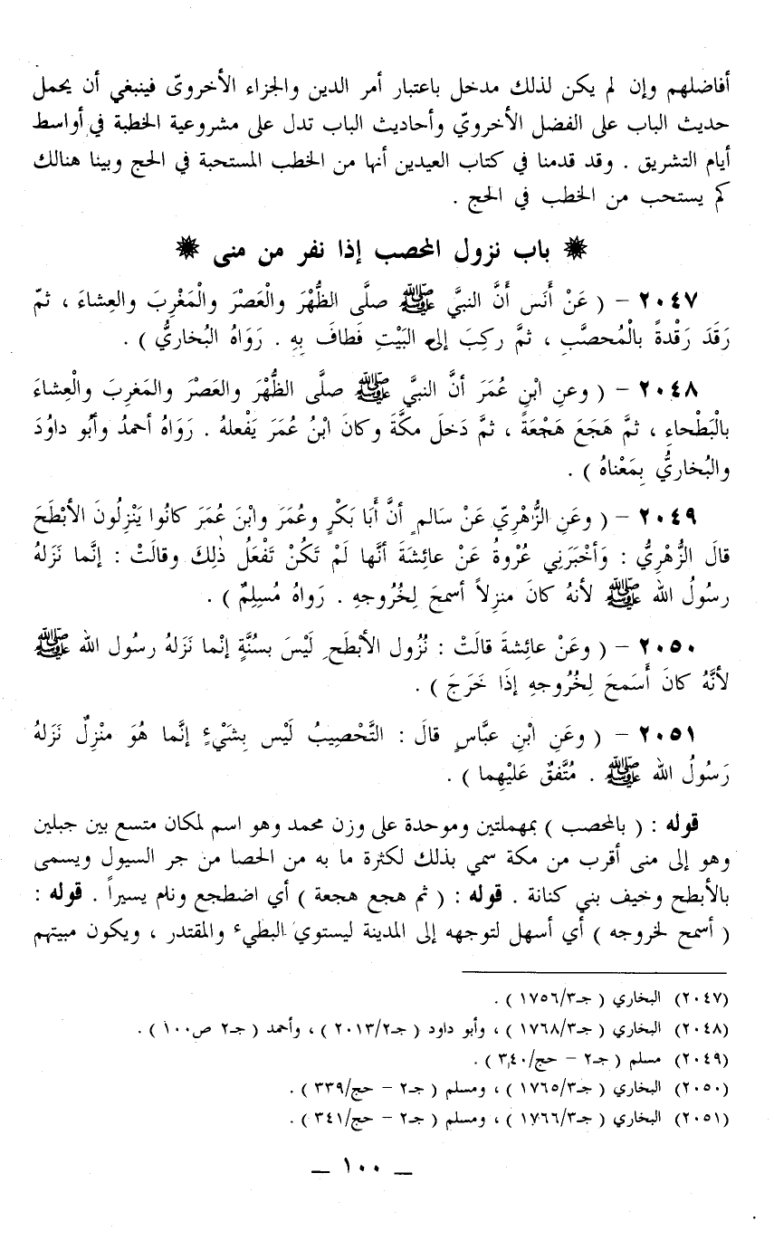 2047 - (عَنْ أَنَسٍ «أَنَّ النَّبِيَّ - صَلَّى اللَّهُ عَلَيْهِ وَسَلَّمَ - صَلَّى الظُّهْرَ وَالْعَصْرَ وَالْمَغْرِبَ وَالْعِشَاءَ، ثُمَّ رَقَدَ رَقْدَةً بِالْمُحَصَّبِ، ثُمَّ رَكِبَ إلَى الْبَيْتِ فَطَافَ بِهِ.» رَوَاهُ الْبُخَارِيُّ)