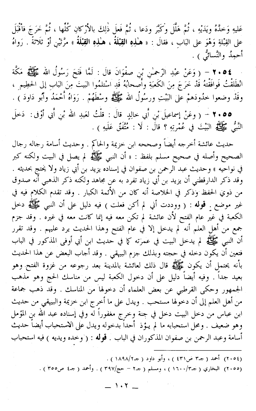 حَدِيثُ عَائِشَةَ أَخْرَجَهُ أَيْضًا وَصَحَّحَهُ ابْنُ خُزَيْمَةَ وَالْحَاكِمُ. وَحَدِيثُ أُسَامَةَ رِجَالُهُ رِجَالُ الصَّحِيحِ وَأَصْلُهُ فِي صَحِيحِ مُسْلِمٍ بِلَفْظِ: «أَنَّ النَّبِيَّ - صَلَّى اللَّهُ عَلَيْهِ وَسَلَّمَ - لَمْ يُصَلِّ فِي الْبَيْتِ وَلَكِنَّهُ كَبَّرَ فِي نَوَاحِيهِ» وَحَدِيثُ عَبْدِ الرَّحْمَنِ بْنِ صَفْوَانَ فِي إسْنَادِهِ يَزِيدُ بْنُ أَبِي زِيَادٍ وَلَا يُحْتَجُّ بِحَدِيثِهِ وَقَدْ ذَكَرَ الدَّارَقُطْنِيّ أَنَّ يَزِيدَ بْنَ أَبِي زِيَادٍ تَفَرَّدَ بِهِ عَنْ مُجَاهِدٍ وَلَكِنَّهُ ذَكَرَ الذَّهَبِيُّ أَنَّهُ صَدُوقٌ مِنْ ذَوِي الْحِفْظِ وَذَكَرَ فِي الْخُلَاصَةِ أَنَّهُ كَانَ مِنْ الْأَئِمَّةِ الْكِبَارِ. وَقَدْ تَقَدَّمَ الْكَلَامُ فِيهِ فِي غَيْرِ مَوْضِعٍ. قَوْلُهُ: (وَوَدِدْتُ أَنِّي لَمْ أَكُنْ فَعَلْتُ) فِيهِ دَلِيلٌ عَلَى أَنَّ النَّبِيَّ - صَلَّى اللَّهُ عَلَيْهِ وَسَلَّمَ - دَخَلَ الْكَعْبَةَ فِي غَيْرِ عَامِ الْفَتْحِ؛ لِأَنَّ عَائِشَةَ لَمْ تَكُنْ مَعَهُ فِيهِ إنَّمَا كَانَتْ مَعَهُ فِي غَيْرِهِ. وَقَدْ جَزَمَ جَمْعٌ مِنْ أَهْلِ الْعِلْمِ أَنَّهُ لَمْ يَدْخُلْ إلَّا فِي عَامِ الْفَتْحِ وَهَذَا الْحَدِيثُ يَرُدُّ عَلَيْهِمْ.