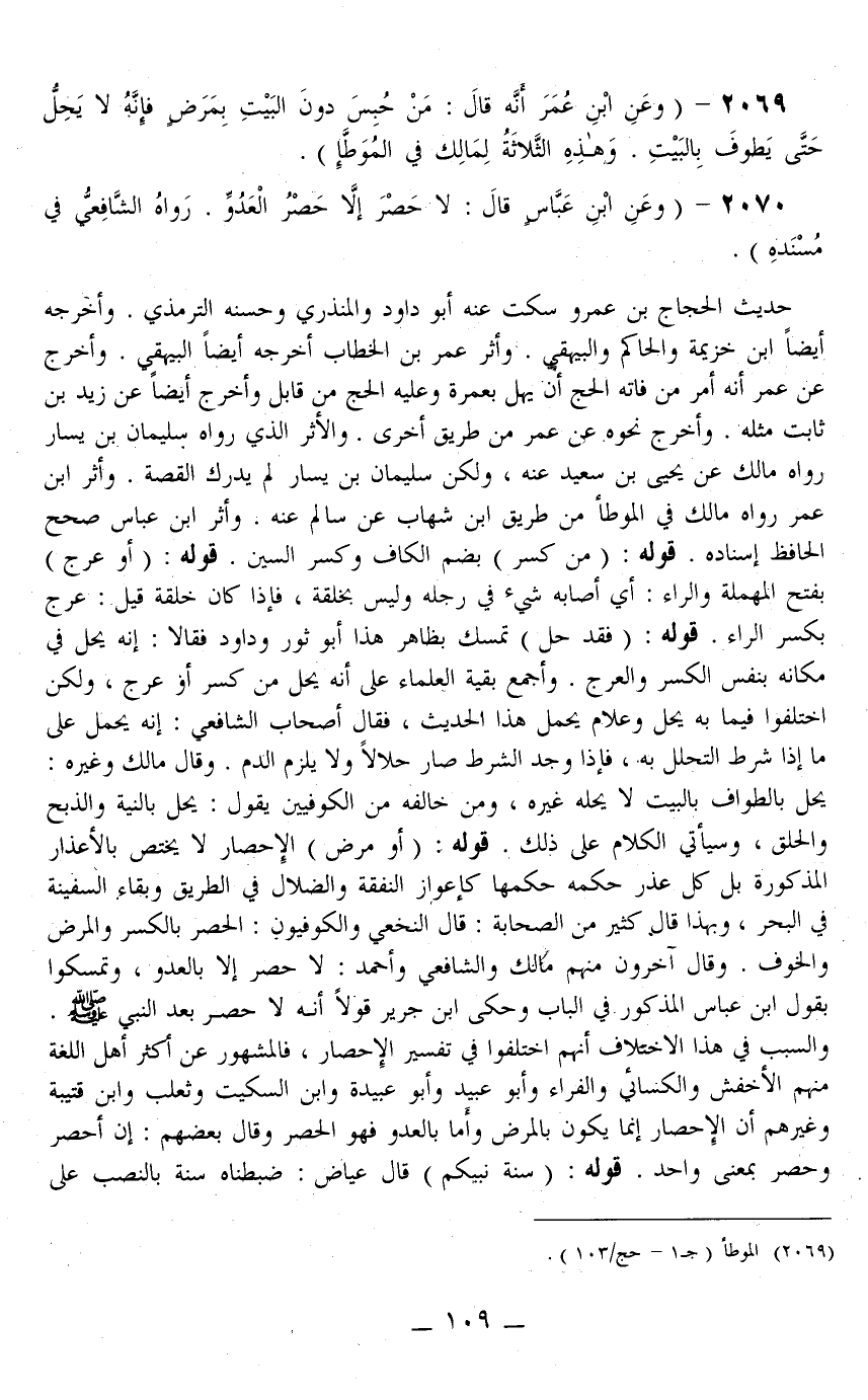 حَدِيثُ الْحَجَّاجِ بْنِ عَمْرٍو سَكَتَ عَنْهُ أَبُو دَاوُد وَالْمُنْذِرِيُّ وَحَسَّنَهُ التِّرْمِذِيُّ وَأَخْرَجَهُ أَيْضًا ابْنُ خُزَيْمَةَ وَالْحَاكِمُ وَالْبَيْهَقِيُّ وَأَثَرُ عُمَرَ بْنِ الْخَطَّابِ أَخْرَجَهُ أَيْضًا الْبَيْهَقِيُّ وَأَخْرَجَ عَنْ عُمَرَ أَنَّهُ أَمَرَ مَنْ فَاتَهُ الْحَجُّ أَنْ يُهِلَّ بِعُمْرَةٍ وَعَلَيْهِ الْحَجُّ مِنْ قَابِلٍ وَأَخْرَجَ أَيْضًا عَنْ زَيْدِ بْنِ ثَابِتٍ مِثْلَهُ. وَأَخْرَجَ نَحْوَهُ عَنْ عُمَرَ مِنْ طَرِيقٍ أُخْرَى وَالْأَثَرُ الَّذِي رَوَاهُ سُلَيْمَانُ بْنُ يَسَارٍ رَوَاهُ مَالِكٌ عَنْ يَحْيَى بْنِ سَعِيدٍ عَنْهُ وَلَكِنَّ سُلَيْمَانَ بْنَ يَسَارٍ لَمْ يُدْرِكْ الْقِصَّةَ وَأَثَرُ ابْنِ عُمَرَ رَوَاهُ مَالِكٌ فِي الْمُوَطَّإِ مِنْ طَرِيقِ ابْنِ شِهَابٍ عَنْ سَالِمٍ عَنْهُ وَأَثَرُ ابْنِ عَبَّاسٍ صَحَّحَ الْحَافِظُ إسْنَادَهُ قَوْلُهُ: (مَنْ كُسِرَ) بِضَمِّ الْكَافِ وَكَسْرِ السِّينِ قَوْلُهُ: (أَوْ عَرَجَ) بِفَتْحِ الْمُهْمَلَةِ وَالرَّاءِ: أَيْ: أَصَابَهُ شَيْءٌ فِي رِجْلِهِ وَلَيْسَ بِخِلْقَةٍ، فَإِذَا كَانَ خِلْقَةً قِيلَ: عَرِجَ بِكَسْرِ الرَّاءِ