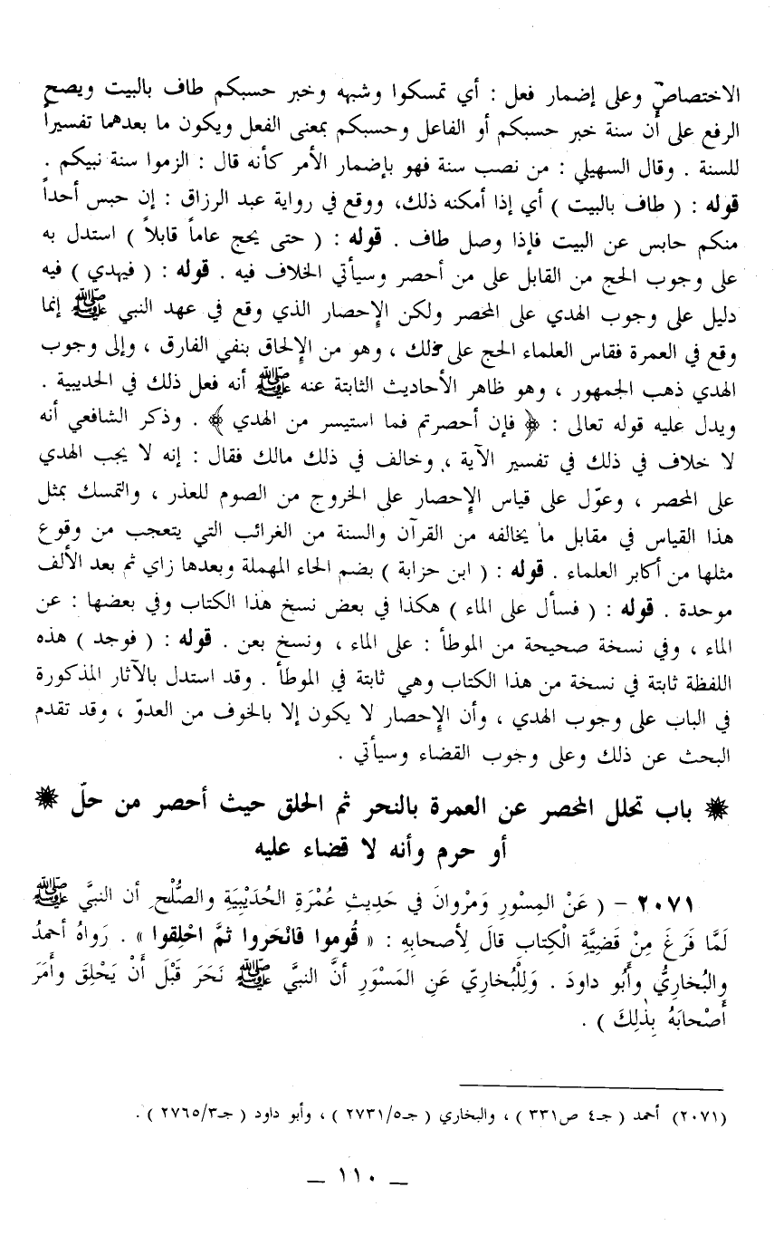 2071 - (عَنْ الْمِسْوَرِ وَمَرْوَانَ فِي حَدِيثِ عُمْرَةِ الْحُدَيْبِيَةِ وَالصُّلْحِ «أَنَّ النَّبِيَّ - صَلَّى اللَّهُ عَلَيْهِ وَسَلَّمَ - لَمَّا فَرَغَ مِنْ قَضِيَّةِ الْكِتَابِ قَالَ لِأَصْحَابِهِ: قُومُوا فَانْحَرُوا ثُمَّ احْلِقُوا.» رَوَاهُ أَحْمَدُ وَالْبُخَارِيُّ وَأَبُو دَاوُد وَلِلْبُخَارِيِّ عَنْ الْمِسْوَرِ «أَنَّ النَّبِيَّ - صَلَّى اللَّهُ عَلَيْهِ وَسَلَّمَ - نَحَرَ قَبْلَ أَنْ يَحْلِقَ وَأَمَرَ أَصْحَابَهُ بِذَلِكَ» )