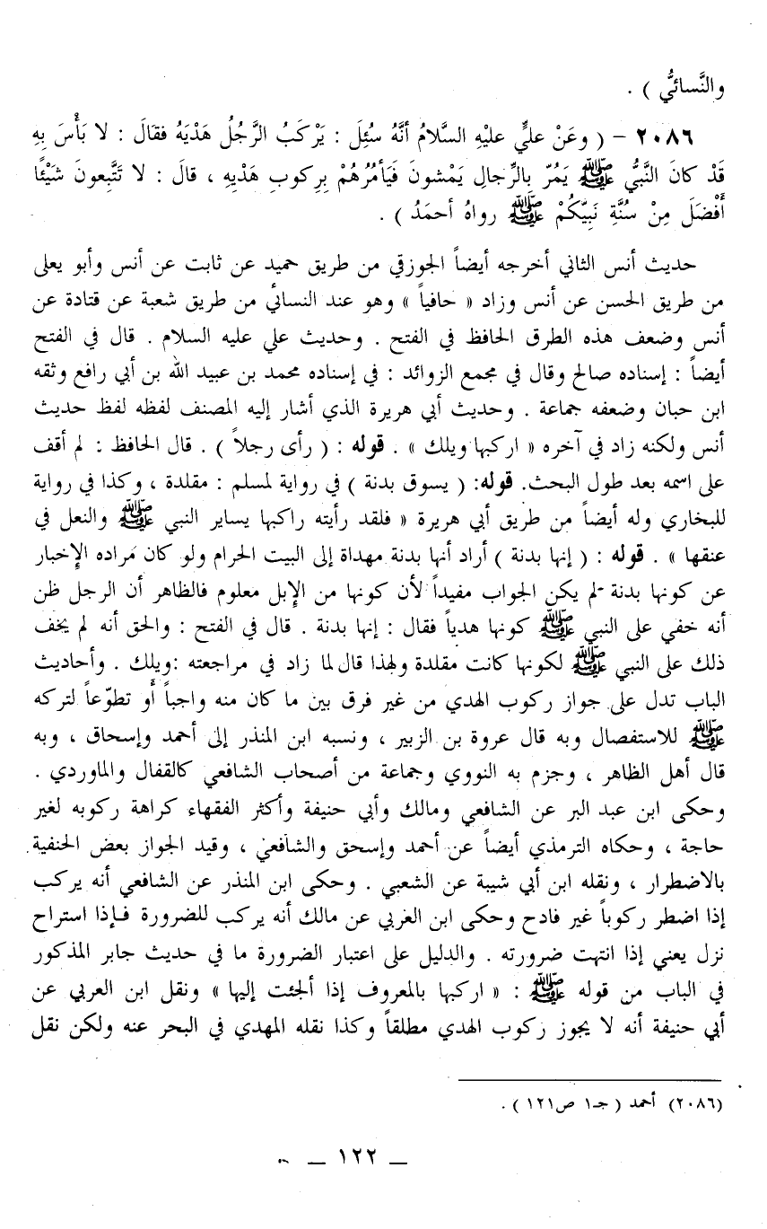 2086 - (وَعَنْ عَلِيٍّ - عَلَيْهِ السَّلَامُ - «أَنَّهُ سُئِلَ: يَرْكَبُ الرَّجُلُ هَدْيَهُ فَقَالَ: لَا بَأْسَ بِهِ قَدْ كَانَ النَّبِيُّ - صَلَّى اللَّهُ عَلَيْهِ وَسَلَّمَ - يَمُرُّ بِالرِّجَالِ يَمْشُونَ فَيَأْمُرُهُمْ بِرُكُوبِ هَدْيِهِ، قَالَ: لَا تَتَّبِعُونَ شَيْئًا أَفْضَلَ مِنْ سُنَّةِ نَبِيِّكُمْ - صَلَّى اللَّهُ عَلَيْهِ وَسَلَّمَ -.» رَوَاهُ أَحْمَدُ)