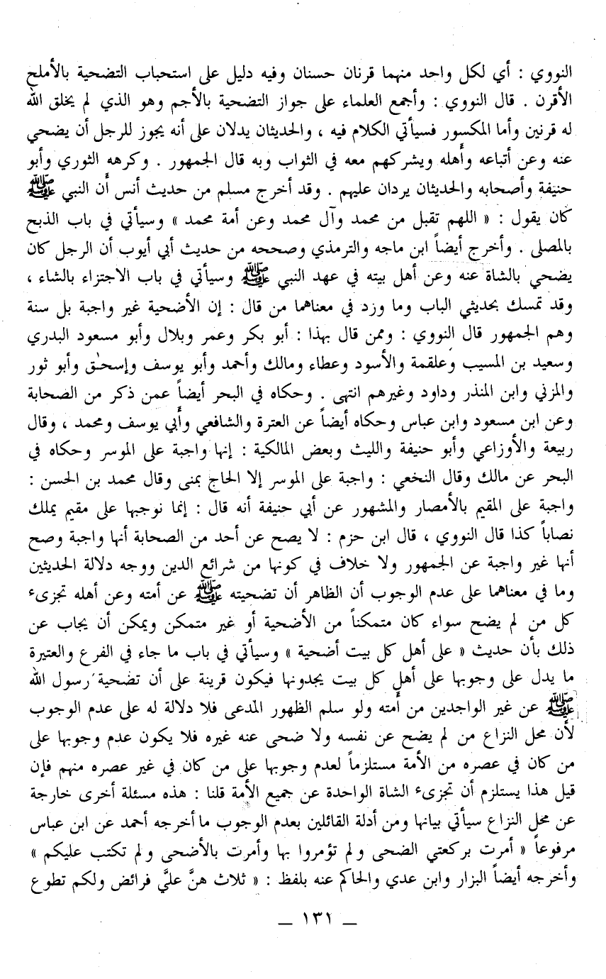 وَحَكَاهُ فِي الْبَحْرِ أَيْضًا عَمَّنْ ذُكِرَ مِنْ الصَّحَابَةِ وَعَنْ ابْنِ مَسْعُودٍ وَابْنِ عَبَّاسٍ وَحَكَاهُ أَيْضًا عَنْ الْعِتْرَةِ وَالشَّافِعِيِّ وَأَبِي يُوسُفَ وَمُحَمَّدٍ، وَقَالَ رَبِيعَةُ وَالْأَوْزَاعِيُّ وَأَبُو حَنِيفَةَ وَاللَّيْثُ وَبَعْضُ الْمَالِكِيَّةِ: إنَّهَا وَاجِبَةٌ عَلَى الْمُوسِرِ وَحَكَاهُ فِي الْبَحْرِ عَنْ مَالِكٍ وَقَالَ النَّخَعِيّ: وَاجِبَةٌ عَلَى الْمُوسِرِ إلَّا الْحَاجَّ بِمِنًى وَقَالَ مُحَمَّدُ بْنُ الْحَسَنِ: وَاجِبَةٌ عَلَى الْمُقِيمِ بِالْأَمْصَارِ وَالْمَشْهُورُ عَنْ أَبِي حَنِيفَةَ أَنَّهُ قَالَ: إنَّمَا نُوجِبُهَا عَلَى مُقِيمٍ يَمْلِكُ نِصَابًا كَذَا قَالَ النَّوَوِيُّ، قَالَ ابْنُ حَزْمٍ: لَا يَصِحُّ عَنْ أَحَدٍ مِنْ الصَّحَابَةِ أَنَّهَا وَاجِبَةٌ وَصَحَّ أَنَّهَا غَيْرُ وَاجِبَةٍ عَنْ الْجُمْهُورِ وَلَا خِلَافَ فِي كَوْنِهَا مِنْ شَرَائِعِ الدِّينِ وَوَجْهُ دَلَالَةِ الْحَدِيثَيْنِ وَمَا فِي مَعْنَاهُمَا عَلَى عَدَمِ الْوُجُوبِ أَنَّ الظَّاهِرَ أَنَّ تَضْحِيَتَهُ - صَلَّى اللَّهُ عَلَيْهِ وَسَلَّمَ - عَنْ أُمَّتِهِ وَعَنْ أَهْلِهِ تُجْزِئُ كُلَّ مَنْ لَمْ يُضَحِّ سَوَاءٌ كَانَ مُتَمَكِّنًا مِنْ الْأُضْحِيَّةِ أَوْ غَيْرَ مُتَمَكِّنٍ وَيُمْكِنُ أَنْ يُجَابَ عَنْ ذَلِكَ بِأَنَّ حَدِيثَ «عَلَى أَهْلِ كُلِّ بَيْتٍ أُضْحِيَّةٌ»