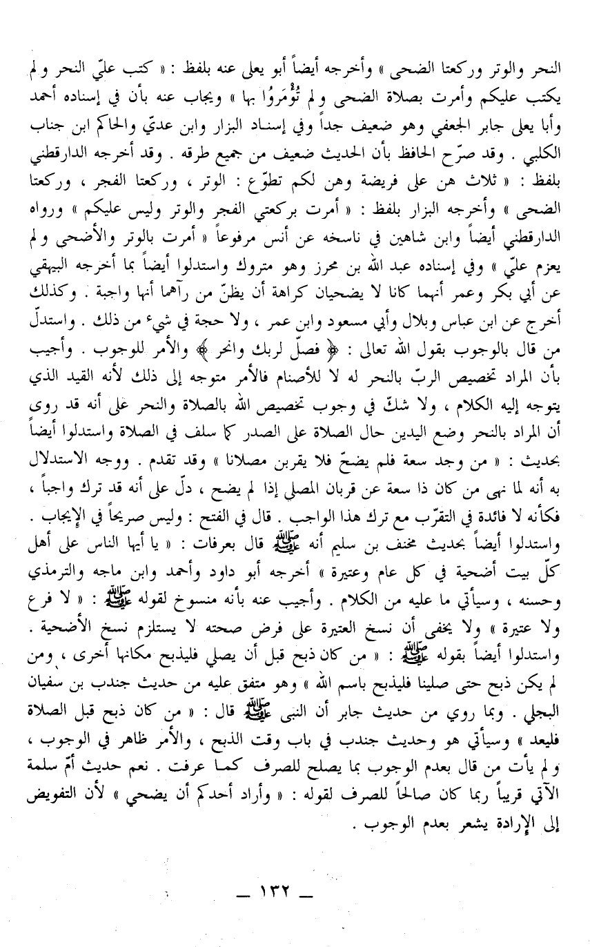 وَلَا حُجَّةَ فِي شَيْءٍ مِنْ ذَلِكَ وَاسْتَدَلَّ مَنْ قَالَ بِالْوُجُوبِ بِقَوْلِ اللَّهِ تَعَالَى: {فَصَلِّ لِرَبِّكَ وَانْحَرْ} [الكوثر: 2] وَالْأَمْرُ لِلْوُجُوبِ. وَأُجِيبَ بِأَنَّ الْمُرَادَ تَخْصِيصُ الرَّبِّ بِالنَّحْرِ لَهُ لَا لِلْأَصْنَامِ فَالْأَمْرُ مُتَوَجِّهٌ إلَى ذَلِكَ؛ لِأَنَّهُ الْقَيْدُ الَّذِي يَتَوَجَّهُ إلَيْهِ الْكَلَامُ، وَلَا شَكَّ فِي وُجُوبِ تَخْصِيصِ اللَّهِ بِالصَّلَاةِ وَالنَّحْرِ عَلَى أَنَّهُ قَدْ رُوِيَ أَنَّ الْمُرَادَ بِالنَّحْرِ وَضْعُ الْيَدَيْنِ حَالَ الصَّلَاةِ عَلَى الصَّدْرِ كَمَا سَلَفَ فِي الصَّلَاةِ وَاسْتَدَلُّوا أَيْضًا بِحَدِيثِ: «مَنْ وَجَدَ سَعَةً فَلَمْ يُضَحِّ فَلَا يَقْرَبَنَّ مُصَلَّانَا» وَقَدْ تَقَدَّمَ.