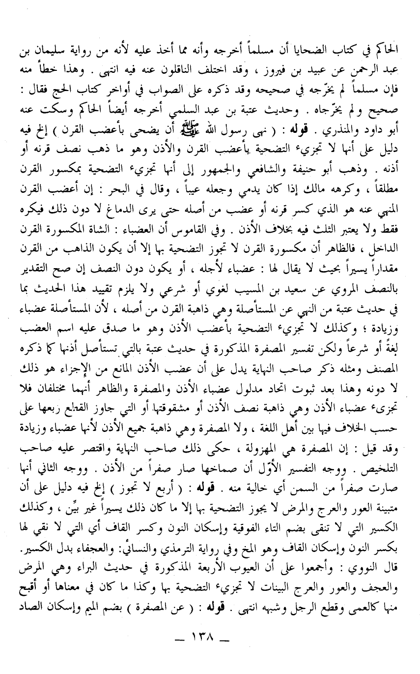 وَفِي الْقَامُوسِ أَنَّ الْعَضْبَاءَ: الشَّاةُ الْمَكْسُورَةُ الْقَرْنِ الدَّاخِلِ، فَالظَّاهِرُ أَنَّ مَكْسُورَةَ الْقَرْنِ لَا تَجُوزُ التَّضْحِيَةُ بِهَا إلَّا أَنْ يَكُونَ الذَّاهِبُ مِنْ الْقَرْنِ مِقْدَارًا يَسِيرًا بِحَيْثُ لَا يُقَالُ لَهَا: عَضْبَاءُ لِأَجْلِهِ، أَوْ يَكُونُ دُونَ النِّصْفِ إنْ صَحَّ التَّقْدِيرُ بِالنِّصْفِ الْمَرْوِيِّ عَنْ سَعِيدِ بْنِ الْمُسَيِّبِ لُغَوِيٌّ أَوْ شَرْعِيٌّ وَلَا يَلْزَمُ تَقْيِيدُ هَذَا الْحَدِيثِ بِمَا فِي حَدِيثِ عُتْبَةُ مِنْ النَّهْيِ عَنْ الْمُسْتَأْصَلَةِ وَهِيَ ذَاهِبَةُ الْقَرْنِ مِنْ أَصْلِهِ، لِأَنَّ الْمُسْتَأْصَلَةَ عَضْبَاءُ وَزِيَادَةٌ، وَكَذَلِكَ لَا تُجْزِئُ التَّضْحِيَةُ بِأَعْضَبِ الْأُذُنِ وَهُوَ مَا صَدَقَ عَلَيْهِ اسْمُ الْعَضْبِ لُغَةً أَوْ شَرْعًا وَلَكِنْ تَفْسِيرُ الْمُصْفَرَةِ الْمَذْكُورَةِ فِي حَدِيثِ عُتْبَةُ بِاَلَّتِي تُسْتَأْصَلُ أُذُنُهَا كَمَا ذَكَرَهُ الْمُصَنِّفُ