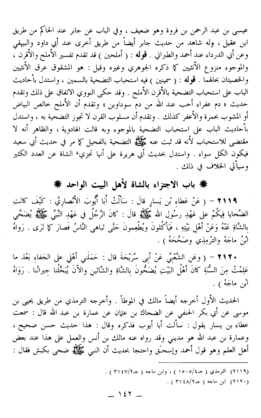 2119 - (عَنْ عَطَاءِ بْنِ يَسَارٍ قَالَ: «سَأَلْت أَبَا أَيُّوبَ الْأَنْصَارِيَّ: كَيْفَ كَانَتْ الضَّحَايَا فِيكُمْ عَلَى عَهْدِ رَسُولِ اللَّهِ - صَلَّى اللَّهُ عَلَيْهِ وَسَلَّمَ - قَالَ: كَانَ الرَّجُلُ فِي عَهْدِ النَّبِيِّ - صَلَّى اللَّهُ عَلَيْهِ وَسَلَّمَ - يُضَحِّي بِالشَّاةِ عَنْهُ وَعَنْ أَهْلِ بَيْتِهِ فَيَأْكُلُونَ وَيُطْعِمُونَ حَتَّى تَبَاهَى النَّاسُ فَصَارَ كَمَا تَرَى» . رَوَاهُ ابْنُ مَاجَهْ وَالتِّرْمِذِيُّ وَصَحَّحَهُ) .