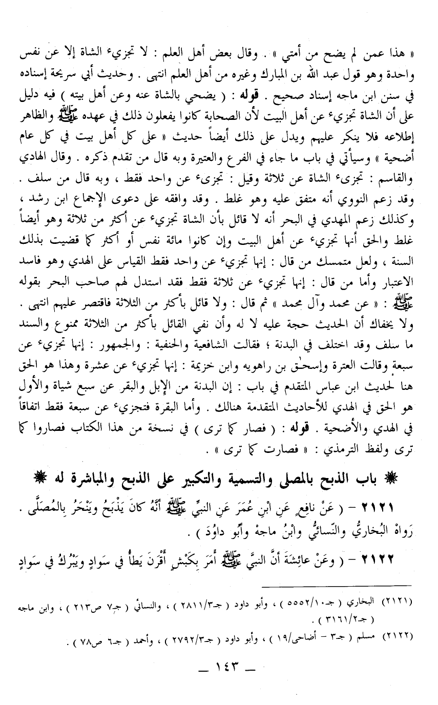 ـــــــــــــــــــــــــــــQهَذَا عَمَّنْ لَمْ يُضَحِّ مِنْ أُمَّتِي» وَقَالَ بَعْضُ أَهْلِ الْعِلْمِ: لَا تُجْزِئُ الشَّاةُ إلَّا عَنْ نَفْسٍ وَاحِدَةٍ وَهُوَ قَوْلُ عَبْدِ اللَّهِ بْنِ الْمُبَارَكِ وَغَيْرِهِ مِنْ أَهْلِ الْعِلْمِ انْتَهَى. وَحَدِيثُ أَبِي سَرِيحَةَ إسْنَادُهُ فِي سُنَنِ ابْنِ مَاجَهْ إسْنَادٌ صَحِيحٌ.