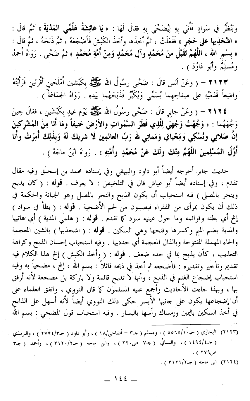 وَيَنْظُرُ فِي سَوَادٍ فَأُتِيَ بِهِ لِيُضَحِّيَ بِهِ فَقَالَ لَهَا يَا عَائِشَةُ هَلُمِّي الْمُدْيَةَ ثُمَّ قَالَ: اشْحَذِيهَا عَلَى حَجَرٍ فَفَعَلَتْ ثُمَّ أَخَذَهَا وَأَخَذَ الْكَبْشَ فَأَضْجَعَهُ ثُمَّ ذَبَحَهُ ثُمَّ قَالَ: بِسْمِ اللَّهِ اللَّهُمَّ تَقَبَّلْ مِنْ مُحَمَّدٍ وَآلِ مُحَمَّدٍ وَمِنْ أُمَّةِ مُحَمَّدٍ ثُمَّ ضَحَّى» . رَوَاهُ أَحْمَدُ وَمُسْلِمٌ وَأَبُو دَاوُد) .