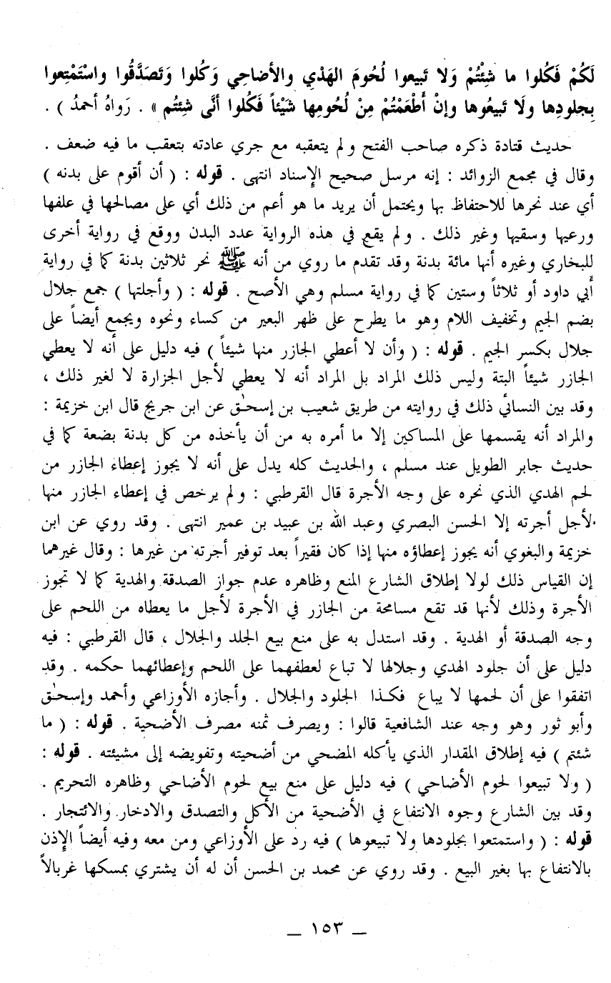 لَكُمْ فَكُلُوا مَا شِئْتُمْ وَلَا تَبِيعُوا لُحُومَ الْهَدْيِ وَالْأَضَاحِيِّ وَكُلُوا وَتَصَدَّقُوا وَاسْتَمْتِعُوا بِجُلُودِهَا. وَلَا تَبِيعُوهَا وَإِنْ أَطْعَمْتُمْ مِنْ لُحُومِهَا شَيْئًا فَكُلُوا أَنَّى شِئْتُمْ» رَوَاهُ أَحْمَدُ)