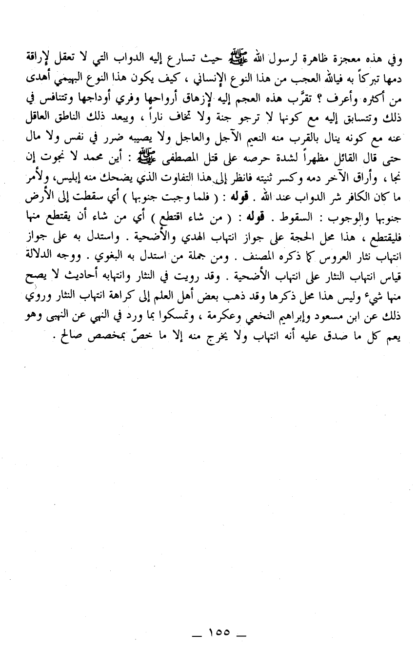 ـــــــــــــــــــــــــــــQوَفِي هَذِهِ مُعْجِزَةٌ ظَاهِرَةٌ لِرَسُولِ اللَّهِ - صَلَّى اللَّهُ عَلَيْهِ وَسَلَّمَ - حَيْثُ تُسَارِعُ إلَيْهِ الدَّوَابُّ الَّتِي لَا تَعْقِلُ لِإِرَاقَةِ دَمِهَا تَبَرُّكًا بِهِ فَيَا لِلَّهِ الْعَجَبُ مِنْ هَذَا النَّوْعِ الْإِنْسَانِيِّ، كَيْفَ يَكُونُ هَذَا النَّوْعُ الْبَهِيمِيِّ أَهْدَى مِنْ أَكْثَرِهِ وَأَعْرَفَ؟ تَقْرُبُ هَذِهِ الْعُجْمُ إلَيْهِ لِإِزْهَاقِ أَرْوَاحِهَا وَفَرْيِ أَوْدَاجِهَا وَتَتَنَافَسُ فِي ذَلِكَ وَتَتَسَابَقُ إلَيْهِ مَعَ كَوْنِهَا لَا تَرْجُو جَنَّةً وَلَا تَخَافُ نَارًا، وَيَبْعُدُ ذَلِكَ النَّاطِقُ الْعَاقِلُ عَنْهُ مَعَ كَوْنِهِ يَنَالُ بِالْقُرْبِ مِنْهُ النَّعِيمَ الْآجِلَ وَالْعَاجِلَ وَلَا يُصِيبُهُ ضَرَرٌ فِي نَفْسٍ وَلَا مَالٍ حَتَّى قَالَ الْقَائِلُ مُظْهِرًا لِشِدَّةِ حِرْصِهِ عَلَى قَتْلِ الْمُصْطَفَى - صَلَّى اللَّهُ عَلَيْهِ وَسَلَّمَ - أَيْنَ مُحَمَّدُ لَا نَجَوْت إنْ نَجَا، وَأَرَاقَ الْآخَرُ دَمَهُ وَكَسَرَ ثَنِيَّتَهُ فَانْظُرْ إلَى هَذَا التَّفَاوُتِ الَّذِي يَضْحَكُ مِنْهُ إبْلِيسُ، وَلِأَمْرٍ مَا كَانَ الْكَافِرُ شَرَّ الدَّوَابِّ عِنْدَ اللَّهِ.