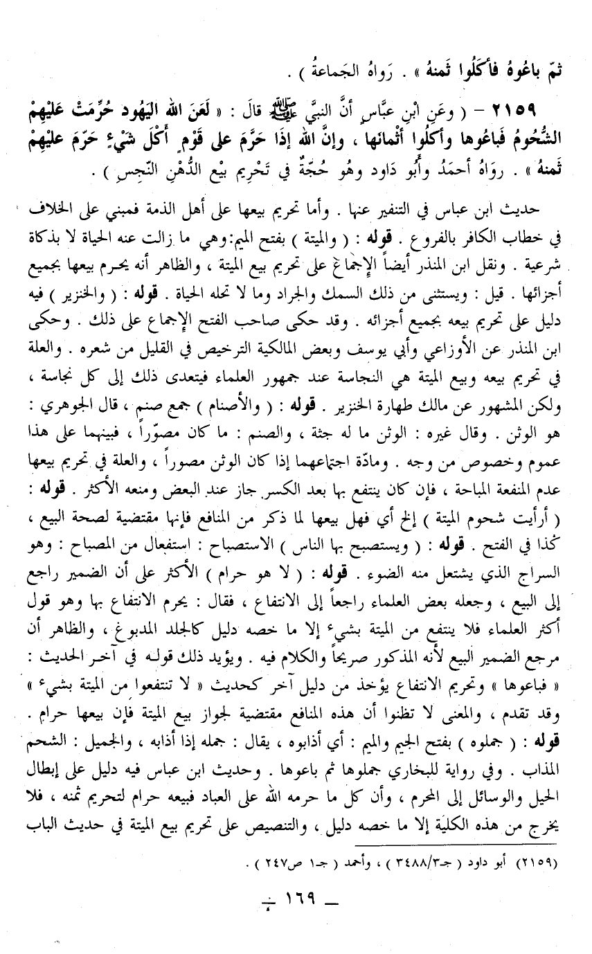 2159 - (وَعَنْ ابْنِ عَبَّاسٍ أَنَّ النَّبِيَّ - صَلَّى اللَّهُ عَلَيْهِ وَسَلَّمَ - قَالَ: «لَعَنَ اللَّهُ الْيَهُودَ حُرِّمَتْ عَلَيْهِمْ الشُّحُومُ فَبَاعُوهَا وَأَكَلُوا أَثْمَانَهَا، وَإِنَّ اللَّهَ إذَا حَرَّمَ عَلَى قَوْمٍ أَكْلَ شَيْءٍ حَرَّمَ عَلَيْهِمْ ثَمَنَهُ» . رَوَاهُ أَحْمَدُ وَأَبُو دَاوُد)
