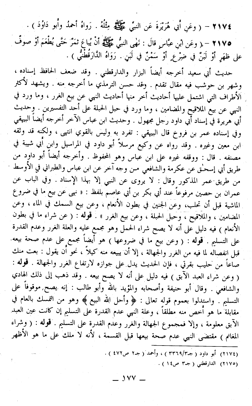 2175 - (وَعَنْ ابْنِ عَبَّاسٍ قَالَ: «نَهَى النَّبِيُّ - صَلَّى اللَّهُ عَلَيْهِ وَسَلَّمَ - أَنْ يُبَاعَ ثَمَرٌ حَتَّى يُطْعَمَ أَوْ صُوفٌ عَلَى ظَهْرٍ أَوْ لَبَنٌ فِي ضَرْعٍ أَوْ سَمْنٌ فِي لَبَنٍ» . رَوَاهُ الدَّارَقُطْنِيّ) .