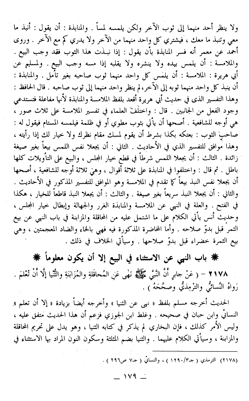 2178 - (عَنْ جَابِرٍ أَنَّ النَّبِيَّ - صَلَّى اللَّهُ عَلَيْهِ وَسَلَّمَ - «نَهَى عَنْ الْمُحَاقَلَةِ وَالْمُزَابَنَةِ وَالثُّنْيَا إلَّا أَنْ تُعْلَمَ» . رَوَاهُ النَّسَائِيّ وَالتِّرْمِذِيُّ وَصَحَّحَهُ) .