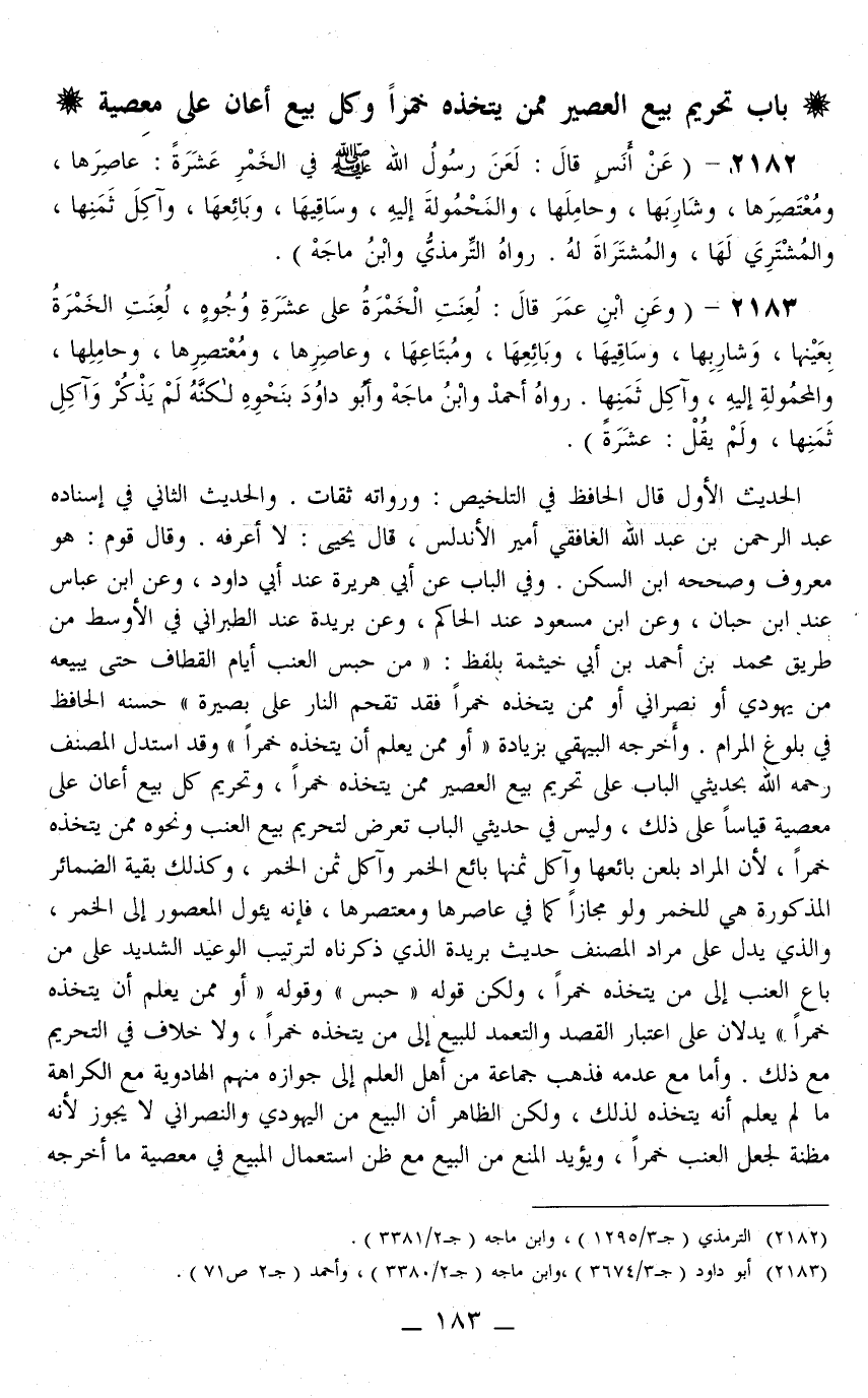 الْحَدِيثُ الْأَوَّلُ قَالَ الْحَافِظُ فِي التَّلْخِيصِ: وَرُوَاتُهُ ثِقَاتٌ. وَالْحَدِيثُ الثَّانِي فِي إسْنَادِهِ عَبْدُ الرَّحْمَنِ بْنُ عَبْدِ اللَّهِ الْغَافِقِيُّ أَمِيرُ الْأَنْدَلُسِ، قَالَ يَحْيَى: لَا أَعْرِفُهُ، وَقَالَ قَوْمٌ: هُوَ مَعْرُوفٌ وَصَحَّحَهُ ابْنُ السَّكَنِ، وَفِي الْبَابِ عَنْ أَبِي هُرَيْرَةَ عِنْدَ أَبِي دَاوُد، وَعَنْ ابْنِ عَبَّاسٍ عِنْدَ ابْنِ حِبَّانَ، وَعَنْ ابْنِ مَسْعُودٍ عِنْدَ الْحَاكِمِ، وَعَنْ بُرَيْدَةَ عِنْدَ الطَّبَرَانِيِّ فِي الْأَوْسَطِ مِنْ طَرِيقِ مُحَمَّدِ بْنِ أَحْمَدَ بْنِ أَبِي خَيْثَمَةَ بِلَفْظِ: «مَنْ حَبَسَ الْعِنَبَ أَيَّامَ الْقِطَافِ حَتَّى يَبِيعَهُ مِنْ يَهُودِيٍّ أَوْ نَصْرَانِيٍّ أَوْ مِمَّنْ يَتَّخِذُهُ خَمْرًا فَقَدْ تَقَحَّمَ النَّارَ عَلَى بَصِيرَةٍ» حَسَّنَهُ الْحَافِظُ فِي بُلُوغِ الْمَرَامِ. وَأَخْرَجَهُ الْبَيْهَقِيُّ بِزِيَادَةِ «أَوْ مِمَّنْ يَعْلَمُ أَنْ يَتَّخِذَهُ خَمْرًا» وَقَدْ اسْتَدَلَّ الْمُصَنِّفُ - رَحِمَهُ اللَّهُ - بِحَدِيثَيْ الْبَابِ عَلَى تَحْرِيمِ بَيْعِ الْعَصِيرِ مِمَّنْ يَتَّخِذُهُ خَمْرًا، وَتَحْرِيمِ كُلِّ بَيْعٍ أَعَانَ عَلَى مَعْصِيَةٍ قِيَاسًا عَلَى ذَلِكَ، وَلَيْسَ فِي حَدِيثَيْ الْبَابِ تَعَرُّضٌ لِتَحْرِيمِ بَيْعِ الْعِنَبِ وَنَحْوِهِ مِمَّنْ يَتَّخِذُهُ خَمْرًا؛ لِأَنَّ الْمُرَادَ بِلَعْنِ بَائِعِهَا وَآكِلِ ثَمَنِهَا بَائِعُ الْخَمْرِ وَآكِلُ ثَمَنِ الْخَمْرِ، وَكَذَلِكَ بَقِيَّةُ الضَّمَائِرِ الْمَذْكُورَةِ هِيَ لِلْخَمْرِ وَلَوْ مَجَازًا كَمَا فِي عَاصِرِهَا وَمُعْتَصِرِهَا، فَإِنَّهُ يَئُولُ الْمَعْصُورُ إلَى الْخَمْرِ، وَاَلَّذِي يَدُلُّ عَلَى مُرَادِ الْمُصَنِّفِ حَدِيثُ بُرَيْدَةَ الَّذِي ذَكَرْنَاهُ لِتَرْتِيبِ الْوَعِيدِ الشَّدِيدِ عَلَى مَنْ بَاعَ الْعِنَبَ إلَى مَنْ يَتَّخِذُهُ خَمْرًا، وَلَكِنَّ قَوْلَهُ " حَبَسَ " وَقَوْلُهُ " أَوْ مِمَّنْ يَعْلَمُ أَنْ يَتَّخِذَهُ خَمْرًا " يَدُلَّانِ عَلَى اعْتِبَارِ الْقَصْدِ وَالتَّعَمُّدِ لِلْبَيْعِ إلَى مَنْ يَتَّخِذُهُ خَمْرًا، وَلَا خِلَافَ فِي التَّحْرِيمِ مَعَ ذَلِكَ.