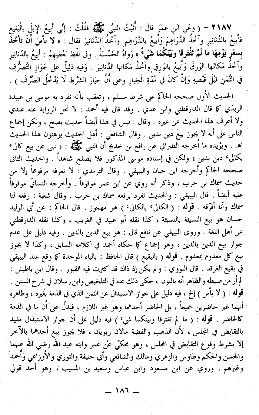 2187 - وَعَنْ ابْنِ عُمَرَ قَالَ: «أَتَيْتُ النَّبِيَّ - صَلَّى اللَّهُ عَلَيْهِ وَسَلَّمَ - فَقُلْت: إنِّي أَبِيعُ الْإِبِلَ بِالْبَقِيعِ فَأَبِيعُ بِالدَّنَانِيرِ وَآخُذُ الدَّرَاهِمَ وَأَبِيعُ بِالدَّرَاهِمِ وَآخُذُ الدَّنَانِيرَ فَقَالَ: لَا بَأْسَ أَنْ تَأْخُذَ بِسِعْرِ يَوْمِهَا مَا لَمْ تَفْتَرِقَا وَبَيْنَكُمَا شَيْءٌ» . رَوَاهُ الْخَمْسَةُ وَفِي لَفْظِ بَعْضِهِمْ: أَبِيعُ بِالدَّنَانِيرِ وَآخُذُ مَكَانَهَا الْوَرِقَ وَأَبِيعُ بِالْوَرِقِ وَآخُذُ مَكَانَهَا الدَّنَانِيرَ