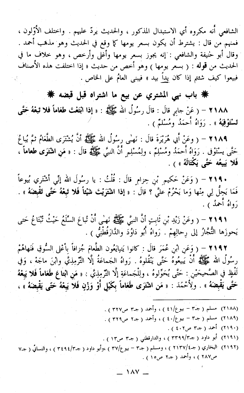 2188 - (عَنْ جَابِرٍ قَالَ: قَالَ رَسُولُ اللَّهِ - صَلَّى اللَّهُ عَلَيْهِ وَسَلَّمَ -: «إذَا ابْتَعْتَ طَعَامًا فَلَا تَبِعْهُ حَتَّى تَسْتَوْفِيَهُ» . رَوَاهُ أَحْمَدُ وَمُسْلِمٌ) .
