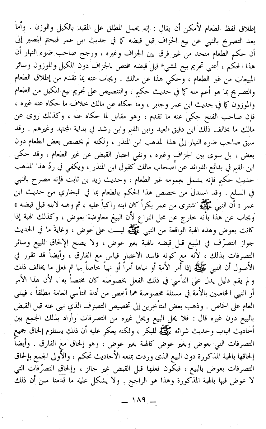 وَقَدْ اسْتَدَلَّ مَنْ خَصَّصَ هَذَا الْحُكْمَ بِالطَّعَامِ بِمَا فِي الْبُخَارِيِّ مِنْ حَدِيثِ ابْنِ عُمَرَ «أَنَّ النَّبِيَّ - صَلَّى اللَّهُ عَلَيْهِ وَسَلَّمَ - اشْتَرَى مِنْ عُمَرَ بَكْرًا كَانَ ابْنُهُ رَاكِبًا عَلَيْهِ، ثُمَّ وَهَبَهُ لِابْنِهِ قَبْلَ قَبْضِهِ» وَيُجَابُ عَنْ هَذَا بِأَنَّهُ خَارِجٌ عَنْ مَحَلِّ النِّزَاعِ؛ لِأَنَّ الْبَيْعَ مُعَاوَضَةٌ بِعِوَضٍ، وَكَذَلِكَ الْهِبَةُ إذَا كَانَتْ بِعِوَضٍ وَهَذِهِ الْهِبَةُ الْوَاقِعَةُ مِنْ النَّبِيِّ - صَلَّى اللَّهُ عَلَيْهِ وَسَلَّمَ - لَيْسَتْ عَلَى عِوَضٍ، وَغَايَةُ مَا فِي الْحَدِيثِ جَوَازُ التَّصَرُّفِ فِي الْمَبِيعِ قَبْلَ قَبْضِهِ بِالْهِبَةِ بِغَيْرِ عِوَضٍ، وَلَا يَصِحُّ الْإِلْحَاقُ لِلْبَيْعِ وَسَائِرِ التَّصَرُّفَاتِ بِذَلِكَ؛ لِأَنَّهُ مَعَ كَوْنِهِ فَاسِدَ الِاعْتِبَارِ قِيَاسٌ مَعَ الْفَارِقِ، وَأَيْضًا قَدْ تَقَرَّرَ فِي الْأُصُولِ أَنَّ النَّبِيَّ - صَلَّى اللَّهُ عَلَيْهِ وَسَلَّمَ - إذَا أَمَرَ الْأُمَّةَ أَوْ نَهَاهَا أَمْرًا أَوْ نَهْيًا خَاصًّا بِهَا ثُمَّ فَعَلَ مَا يُخَالِفُ ذَلِكَ وَلَمْ يَقُمْ دَلِيلٌ يَدُلُّ عَلَى التَّأَسِّي فِي ذَلِكَ الْفِعْلِ بِخُصُوصِهِ كَانَ مُخْتَصًّا بِهِ؛ لِأَنَّ هَذَا الْأَمْرَ أَوْ النَّهْيَ الْخَاصَّيْنِ بِالْأُمَّةِ فِي مَسْأَلَةٍ مَخْصُوصَةٍ هُمَا أَخَصُّ مِنْ أَدِلَّةِ التَّأَسِّي الْعَامَّةِ مُطْلَقًا، فَيُبْنَى الْعَامُّ عَلَى الْخَاصِّ.
