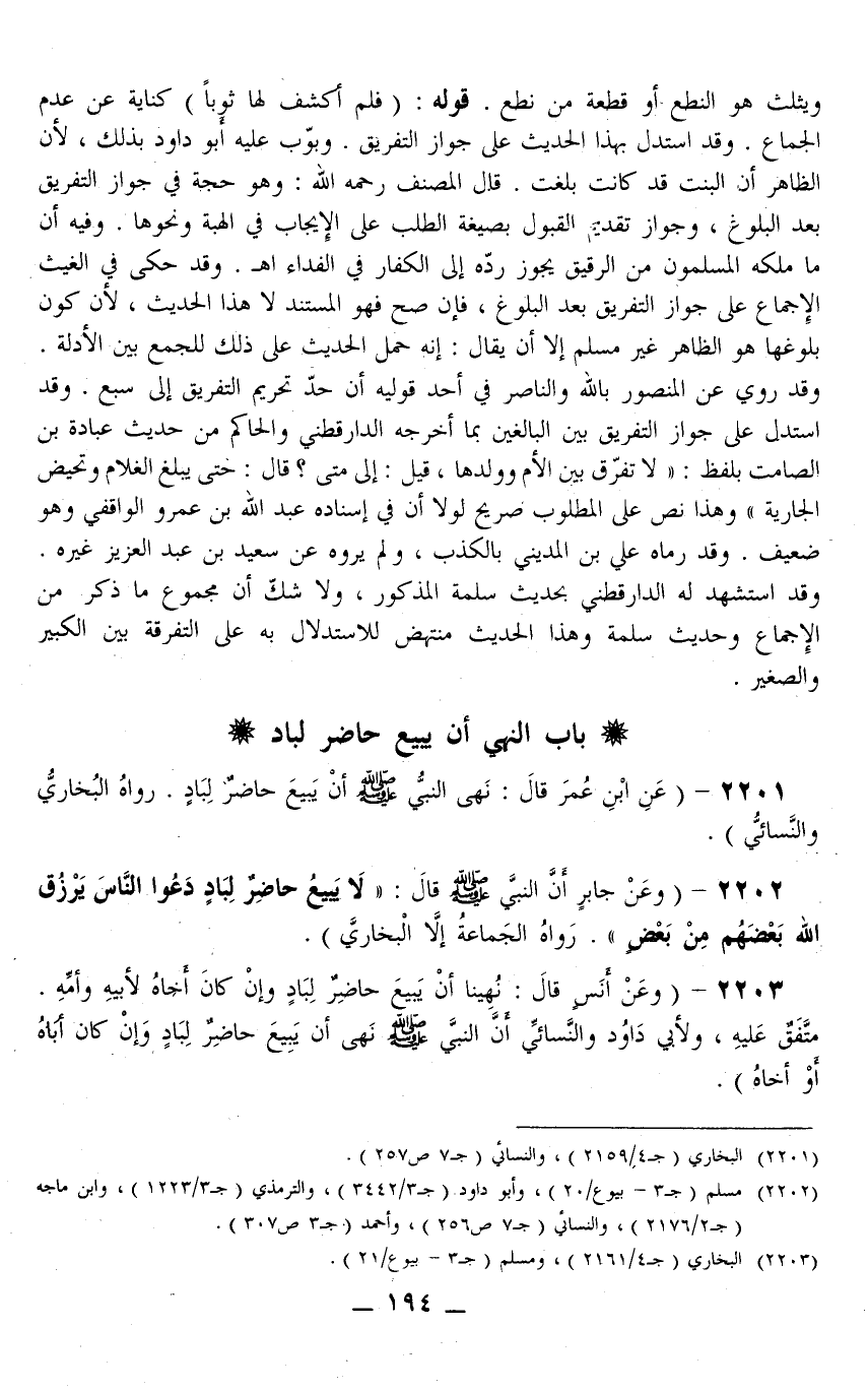 2201 - (عَنْ ابْنِ عُمَرَ قَالَ: «نَهَى النَّبِيُّ - صَلَّى اللَّهُ عَلَيْهِ وَسَلَّمَ - أَنْ يَبِيعَ حَاضِرٌ لِبَادٍ.» رَوَاهُ الْبُخَارِيُّ وَالنَّسَائِيُّ) .