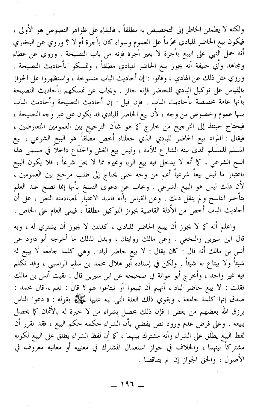 وَرُوِيَ عَنْ عَطَاءَ وَمُجَاهِدٍ وَأَبِي حَنِيفَةَ أَنَّهُ يَجُوزُ بَيْعُ الْحَاضِرِ لِلْبَادِي مُطْلَقًا، وَتَمَسَّكُوا بِأَحَادِيثِ النَّصِيحَةِ وَرُوِيَ مِثْلُ ذَلِكَ عَنْ الْهَادِي، وَقَالُوا: إنَّ أَحَادِيثَ الْبَابِ مَنْسُوخَةٌ، وَاسْتَظْهَرُوا عَلَى الْجَوَازِ بِالْقِيَاسِ عَلَى تَوْكِيلِ الْبَادِي لِلْحَاضِرِ فَإِنَّهُ جَائِزٌ، وَيُجَابُ عَنْ تَمَسُّكِهِمْ بِأَحَادِيثِ النَّصِيحَةِ بِأَنَّهَا عَامَّةٌ مُخَصَّصَةٌ بِأَحَادِيثِ الْبَابِ. فَإِنْ قِيلَ: إنَّ أَحَادِيثَ النَّصِيحَةِ وَأَحَادِيثَ الْبَابِ بَيْنَهَا عُمُومٌ وَخُصُوصٌ مِنْ وَجْهٍ؛ لِأَنَّ بَيْعَ الْحَاضِرِ لِلْبَادِي قَدْ يَكُونُ عَلَى غَيْرِ وَجْهِ النَّصِيحَةِ، فَيُحْتَاجُ حِينَئِذٍ إلَى التَّرْجِيحِ مِنْ خَارِجٍ كَمَا هُوَ شَأْنُ التَّرْجِيحِ بَيْنَ الْعُمُومَيْنِ الْمُتَعَارِضَيْنِ، فَيُقَالُ: الْمُرَادُ بَيْعُ الْحَاضِرِ لِلْبَادِي الَّذِي جَعَلْنَاهُ أَخَصَّ مُطْلَقًا هُوَ الْبَيْعُ الشَّرْعِيُّ، بَيْعُ الْمُسْلِمِ لِلْمُسْلِمِ الَّذِي بَيَّنَهُ الشَّارِعُ لِلْأُمَّةِ، وَلَيْسَ بَيْعُ الْغِشِّ وَالْخِدَاعِ دَاخِلًا فِي مُسَمَّى هَذَا الْبَيْعِ الشَّرْعِيِّ، كَمَا أَنَّهُ لَا يَدْخُلُ فِيهِ بَيْعُ الرِّبَا وَغَيْرُهُ مِمَّا لَا يَحِلُّ شَرْعًا، فَلَا يَكُونُ الْبَيْعُ بِاعْتِبَارِ مَا لَيْسَ بَيْعًا شَرْعِيًّا أَعَمَّ مِنْ وَجْهٍ حَتَّى يُحْتَاجَ إلَى طَلَبِ مُرَجِّحٍ بَيْنَ الْعُمُومَيْنِ؛ لِأَنَّ ذَلِكَ لَيْسَ هُوَ الْبَيْعَ الشَّرْعِيَّ