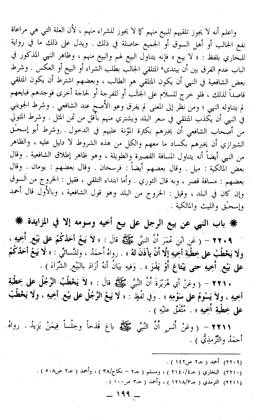 2209 - (عَنْ ابْنِ عُمَرَ أَنَّ النَّبِيَّ - صَلَّى اللَّهُ عَلَيْهِ وَسَلَّمَ - قَالَ: «لَا يَبِعْ أَحَدُكُمْ عَلَى بَيْعِ أَخِيهِ وَلَا يَخْطُبْ عَلَى خِطْبَةِ أَخِيهِ إلَّا أَنْ يَأْذَنَ لَهُ.» رَوَاهُ أَحْمَدُ، وَلِلنَّسَائِيِّ: «لَا يَبِيعُ أَحَدُكُمْ عَلَى بَيْعِ أَخِيهِ حَتَّى يَبْتَاعَ أَوْ يَذَرَ» وَفِيهِ بَيَانُ أَنَّهُ أَرَادَ بِالْبَيْعِ الشِّرَاءَ) .