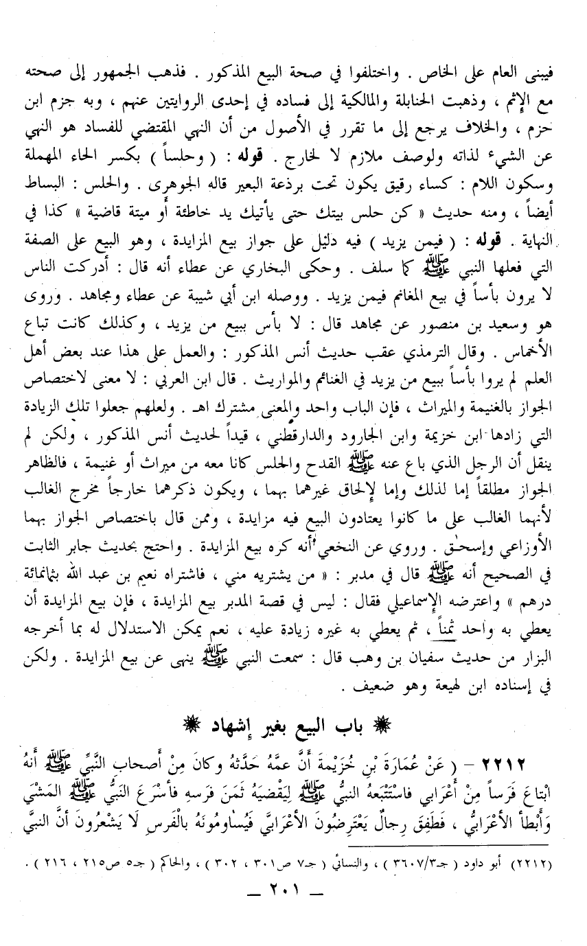 2212 - (عَنْ عُمَارَةَ بْنِ خُزَيْمَةَ أَنَّ عَمَّهُ حَدَّثَهُ وَكَانَ مِنْ أَصْحَابِ النَّبِيِّ - صَلَّى اللَّهُ عَلَيْهِ وَسَلَّمَ - «أَنَّهُ ابْتَاعَ فَرَسًا مِنْ أَعْرَابِيٍّ فَاسْتَتْبَعَهُ النَّبِيُّ - صَلَّى اللَّهُ عَلَيْهِ وَسَلَّمَ - لِيَقْضِيَهُ ثَمَنَ فَرَسِهِ فَأَسْرَعَ النَّبِيُّ - صَلَّى اللَّهُ عَلَيْهِ وَسَلَّمَ - الْمَشْيَ وَأَبْطَأَ الْأَعْرَابِيُّ، فَطَفِقَ رِجَالٌ يَعْتَرِضُونَ الْأَعْرَابِيَّ فَيُسَاوِمُونَهُ بِالْفَرَسِ لَا يَشْعُرُونَ أَنَّ النَّبِيَّ