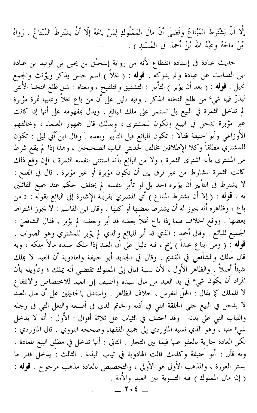 حَدِيثُ عُبَادَةَ فِي إسْنَادِهِ انْقِطَاعٌ؛ لِأَنَّهُ مِنْ رِوَايَةِ إِسْحَاقَ بْنِ يَحْيَى بْنِ الْوَلِيدِ بْنِ عُبَادَةَ بْنِ الصَّامِتِ عَنْ عُبَادَةَ وَلَمْ يُدْرِكْهُ. قَوْلُهُ: (نَخْلًا) اسْمُ جِنْسٍ يُذَكَّرُ وَيُؤَنَّثُ وَالْجَمْع نَخِيلٌ. قَوْلُهُ: (بَعْدَ أَنْ يُؤَبَّرَ) التَّأْبِيرُ: التَّشْقِيقُ وَالتَّلْقِيحُ، وَمَعْنَاهُ: شَقُّ طَلْعِ النَّخْلَةِ الْأُنْثَى لِيُذَرَّ فِيهَا شَيْءٌ مِنْ طَلْعِ النَّخْلَةِ الذَّكَرِ. وَفِيهِ دَلِيلٌ عَلَى أَنَّ مَنْ بَاعَ نَخْلًا وَعَلَيْهَا ثَمَرَةٌ مُؤَبَّرَةٌ لَمْ تَدْخُلْ الثَّمَرَةُ فِي الْبَيْعِ بَلْ تَسْتَمِرُّ عَلَى مِلْكِ الْبَائِعِ، وَيَدُلُّ بِمَفْهُومِهِ عَلَى أَنَّهَا إذَا كَانَتْ غَيْرَ مُؤَبَّرَةٍ تَدْخُلُ فِي الْبَيْعِ وَتَكُونُ لِلْمُشْتَرِي، وَبِذَلِكَ قَالَ جُمْهُورُ الْعُلَمَاءِ، وَخَالَفَهُمْ الْأَوْزَاعِيُّ وَأَبُو حَنِيفَةَ فَقَالَا: تَكُونُ لِلْبَائِعِ قَبْلَ التَّأْبِيرِ وَبَعْدَهُ وَقَالَ ابْنُ أَبِي لَيْلَى: تَكُونُ لِلْمُشْتَرِي مُطْلَقًا، وَكِلَا الْإِطْلَاقَيْنِ مُخَالِفٌ لِحَدِيثَيْ الْبَابِ الصَّحِيحَيْنِ، وَهَذَا إذَا لَمْ يَقَعْ شَرْطٌ مِنْ الْمُشْتَرِي بِأَنَّهُ اشْتَرَى الثَّمَرَةَ، وَلَا مِنْ الْبَائِعِ بِأَنَّهُ اسْتَثْنَى لِنَفْسِهِ الثَّمَرَةَ، فَإِنْ وَقَعَ ذَلِكَ كَانَتْ الثَّمَرَةُ لِلشَّارِطِ مِنْ غَيْرِ فَرْقٍ بَيْنَ أَنْ تَكُونَ مُؤَبَّرَةً أَوْ غَيْرِ مُؤَبَّرَةٍ.
