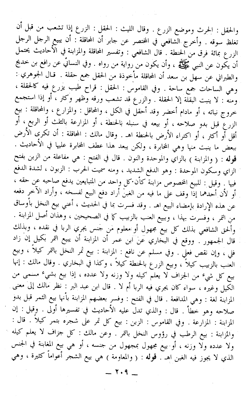 ـــــــــــــــــــــــــــــQوَالْحَقْلُ الْحَارِثُ وَمَوْضِعُ الزَّرْعِ وَقَالَ اللَّيْثُ: الْحَقْلُ: الزَّرْعُ إذَا تَشَعَّبَ مِنْ قَبْلِ أَنْ تَغْلُظَ سُوقُهُ، وَأَخْرَجَ الشَّافِعِيُّ فِي الْمُخْتَصَرِ عَنْ جَابِرٍ أَنَّ الْمُحَاقَلَةَ: أَنْ يَبِيعَ الرَّجُلُ الرَّجُلَ الزَّرْعَ بِمِائَةِ فَرْقٍ مِنْ الْحِنْطَةِ. قَالَ الشَّافِعِيُّ: وَتَفْسِيرُ الْمُحَاقَلَةِ وَالْمُزَابَنَةِ فِي الْأَحَادِيثِ يُحْتَمَلُ أَنْ يَكُونَ عَنْ النَّبِيِّ - صَلَّى اللَّهُ عَلَيْهِ وَسَلَّمَ - أَنْ يَكُونَ مِنْ رِوَايَةِ مَنْ رَوَاهُ وَفِي النَّسَائِيّ عَنْ رَافِعِ بْنِ خَدِيجٍ وَالطَّبَرَانِيِّ عَنْ سَهْلِ بْنِ سَعْدٍ أَنَّ الْمُحَاقَلَةَ مَأْخُوذَةٌ مِنْ الْحَقْلِ جَمْعُ حَقْلَةٍ قَالَ الْجَوْهَرِيُّ وَهِيَ السَّاحَاتُ جَمْعُ سَاحَةٍ، وَفِي الْقَامُوسِ: الْحَقْلُ قَرَاحٌ طَيِّبٌ يُزْرَعُ فِيهِ كَالْحَقْلَةِ، وَمِنْهُ: لَا يُنْبِتُ الْبَقْلَةَ إلَّا الْحَقْلَةُ وَالزَّرْعُ قَدْ تَشَعَّبَ وَرَقُهُ وَظَهَرَ وَكَثُرَ، أَوْ إذَا اسْتَجْمَعَ خُرُوجَ نَبَاتِهِ، أَوْ مَا دَامَ أَخْضَرَ وَقَدْ أَحْقَلَ فِي الْكُلِّ، وَالْمَحَاقِلُ الْمَزَارِعُ، وَالْمُحَاقَلَةُ: بَيْعُ الزَّرْعِ قَبْلَ بُدُوِّ صَلَاحِهِ، أَوْ بَيْعُهُ فِي سُنْبُلِهِ بِالْحِنْطَةِ، أَوْ الْمُزَارَعَةُ بِالثُّلُثِ أَوْ الرُّبُعِ، أَوْ أَقَلَّ أَوْ أَكْثَرَ، أَوْ اكْتِرَاءُ الْأَرْضِ بِالْحِنْطَةِ اهـ.