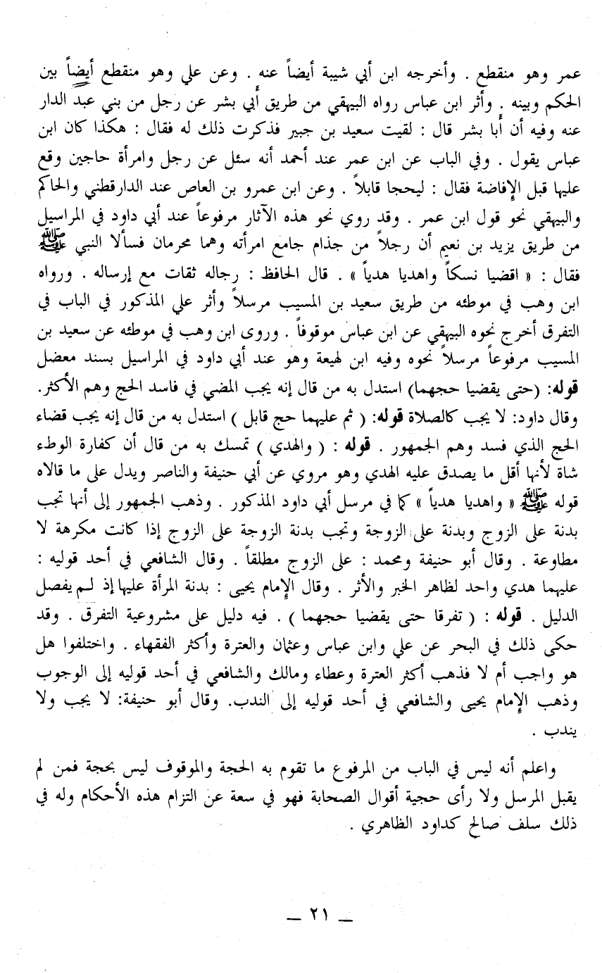 وَعَنْ عَلِيٍّ وَهُوَ مُنْقَطِعٌ أَيْضًا بَيْنَ الْحَكَمِ وَبَيْنَهُ وَأَثَرُ ابْنِ عَبَّاسٍ رَوَاهُ الْبَيْهَقِيُّ مِنْ طَرِيقِ أَبِي بِشْرٍ عَنْ رَجُلٍ مِنْ بَنِي عَبْدِ الدَّارِ عَنْهُ وَفِيهِ أَنَّ أَبَا بِشْرٍ قَالَ: لَقِيتُ سَعِيدَ بْنَ جُبَيْرٍ فَذَكَرْتُ ذَلِكَ لَهُ فَقَالَ: هَكَذَا كَانَ ابْنُ عَبَّاسٍ يَقُولُ وَفِي الْبَابِ عَنْ ابْنِ عُمَرَ عِنْدَ أَحْمَدَ أَنَّهُ سُئِلَ عَنْ رَجُلٍ وَامْرَأَةٍ حَاجَّيْنِ وَقَعَ عَلَيْهَا قَبْلَ الْإِفَاضَةِ فَقَالَ: لِيَحُجَّا قَابِلًا وَعَنْ ابْنِ عَمْرِو بْنِ الْعَاصِ عِنْدَ الدَّارَقُطْنِيّ وَالْحَاكِمِ وَالْبَيْهَقِيِّ نَحْوُ قَوْلِ ابْنِ عُمَرَ وَقَدْ رُوِيَ نَحْوُ هَذِهِ الْآثَارِ مَرْفُوعًا عِنْدَ أَبِي دَاوُد فِي الْمَرَاسِيلِ مِنْ طَرِيقِ يَزِيدَ بْنِ نُعَيْمٍ «أَنَّ رَجُلًا مِنْ جُذَامٍ جَامَعَ امْرَأَتَهُ وَهُمَا مُحْرِمَانِ فَسَأَلَا النَّبِيَّ - صَلَّى اللَّهُ عَلَيْهِ وَسَلَّمَ - فَقَالَ: اقْضِيَا نُسُكًا وَاهْدِيَا هَدْيًا» قَالَ الْحَافِظُ: رِجَالُهُ ثِقَاتٌ مَعَ إرْسَالِهِ وَرَوَاهُ ابْنُ وَهْبٍ فِي مُوَطَّئِهِ مِنْ طَرِيقِ سَعِيدِ بْنِ الْمُسَيِّبِ مُرْسَلًا وَأَثَرُ عَلِيٍّ الْمَذْكُورُ فِي الْبَابِ فِي التَّفَرُّقِ. أَخْرَجَ نَحْوَهُ الْبَيْهَقِيُّ عَنْ ابْنِ عَبَّاسٍ مَوْقُوفًا وَرَوَى ابْنُ وَهْبٍ فِي مُوَطَّئِهِ عَنْ سَعِيدِ بْنِ الْمُسَيِّبِ مَرْفُوعًا مُرْسَلًا نَحْوَهُ وَفِيهِ ابْنُ لَهِيعَةَ وَهُوَ عِنْدَ أَبِي دَاوُد فِي الْمَرَاسِيلِ بِسَنَدٍ مُعْضِلٍ.