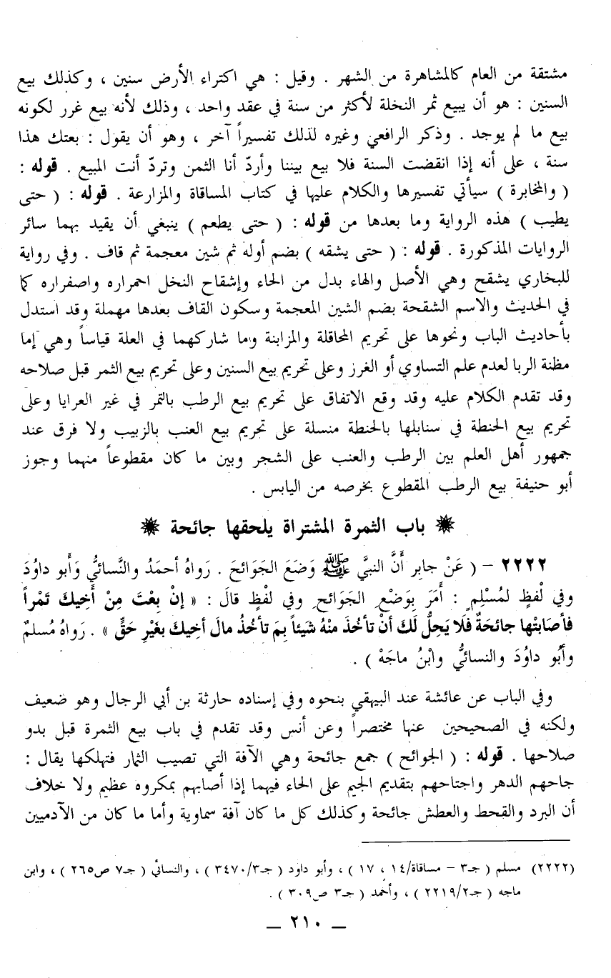 2222 - (عَنْ جَابِرٍ «أَنَّ النَّبِيَّ - صَلَّى اللَّهُ عَلَيْهِ وَسَلَّمَ - وَضَعَ الْجَوَائِحَ» . رَوَاهُ أَحْمَدُ وَالنَّسَائِيُّ وَأَبُو دَاوُد وَفِي لَفْظٍ لِمُسْلِمٍ: «أَمَرَ بِوَضْعِ الْجَوَائِحِ» وَفِي لَفْظٍ قَالَ: «إنْ بِعْتَ مِنْ أَخِيكَ تَمْرًا، فَأَصَابَتْهَا جَائِحَةٌ فَلَا يَحِلُّ لَكَ أَنْ تَأْخُذَ مِنْهُ شَيْئًا، بِمَ تَأْخُذُ مَالَ أَخِيكَ بِغَيْرِ حَقٍّ؟ .» رَوَاهُ مُسْلِمٌ وَأَبُو دَاوُد وَالنَّسَائِيُّ وَابْنُ مَاجَهْ) .