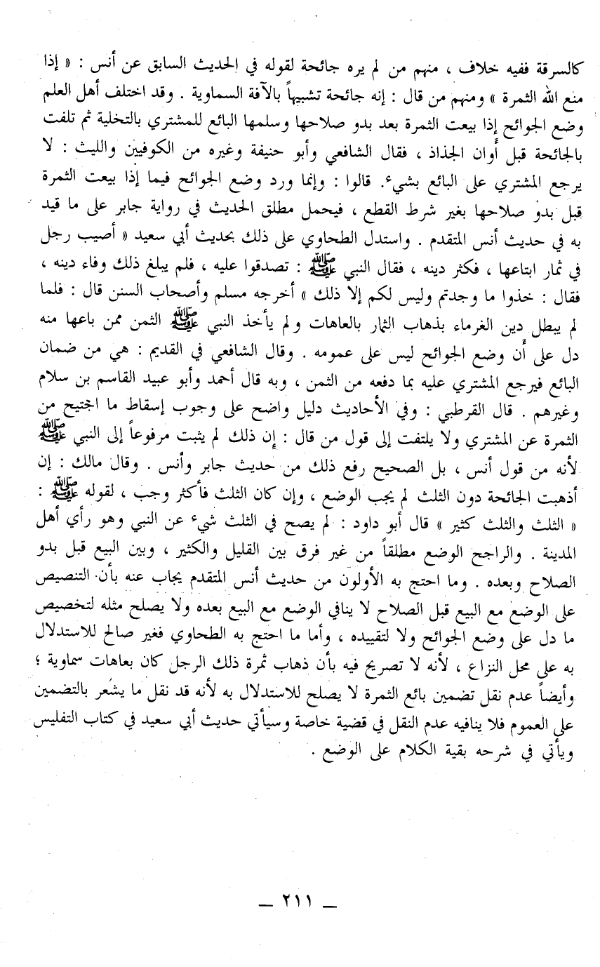 وَاسْتَدَلَّ الطَّحَاوِيُّ عَلَى ذَلِكَ بِحَدِيثِ أَبِي سَعِيدٍ «أُصِيبَ رَجُلٌ فِي ثِمَارٍ ابْتَاعَهَا، فَكَثُرَ دَيْنُهُ، فَقَالَ النَّبِيُّ - صَلَّى اللَّهُ عَلَيْهِ وَسَلَّمَ -: تَصَدَّقُوا عَلَيْهِ، فَلَمْ يَبْلُغْ ذَلِكَ وَفَاءَ دَيْنِهِ فَقَالَ: خُذُوا مَا وَجَدْتُمْ وَلَيْسَ لَكُمْ إلَّا ذَلِكَ» أَخْرَجَهُ مُسْلِمٌ وَأَصْحَابُ السُّنَنِ قَالَ: فَلَمَّا لَمْ يُبْطِلْ دَيْنَ الْغُرَمَاءِ بِذَهَابِ الثِّمَارِ بِالْعَاهَاتِ وَلَمْ يَأْخُذْ النَّبِيُّ - صَلَّى اللَّهُ عَلَيْهِ وَسَلَّمَ - الثَّمَنَ مِمَّنْ بَاعَهَا مِنْهُ دَلَّ عَلَى أَنَّ وَضْعَ الْجَوَائِحِ لَيْسَ عَلَى عُمُومِهِ، وَقَالَ الشَّافِعِيُّ فِي الْقَدِيمِ: هِيَ مِنْ ضَمَانِ الْبَائِعِ فَيَرْجِعُ الْمُشْتَرِي عَلَيْهِ بِمَا دَفَعَهُ مِنْ الثَّمَنِ وَبِهِ قَالَ أَحْمَدُ وَأَبُو عُبَيْدٍ الْقَاسِمُ بْنِ سَلَّامٍ وَغَيْرُهُمْ. قَالَ الْقُرْطُبِيُّ: وَفِي الْأَحَادِيثِ دَلِيلٌ وَاضِحٌ عَلَى وُجُوبِ إسْقَاطِ مَا اُجْتِيحَ مِنْ الثَّمَرَةِ عَنْ الْمُشْتَرِي وَلَا يُلْتَفَتُ إلَى قَوْلِ مَنْ قَالَ: إنَّ ذَلِكَ لَمْ يَثْبُتْ مَرْفُوعًا إلَى النَّبِيِّ - صَلَّى اللَّهُ عَلَيْهِ وَسَلَّمَ -؛ لِأَنَّهُ مِنْ قَوْلِ أَنَسٍ، بَلْ الصَّحِيحُ رَفْعُ ذَلِكَ مِنْ حَدِيثِ جَابِرٍ وَأَنَسٍ، وَقَالَ مَالِكٌ: إنْ أَذْهَبَتْ الْجَائِحَةُ دُونَ الثُّلُثِ لَمْ يَجِبْ الْوَضْعُ، وَإِنْ كَانَ الثُّلُثَ فَأَكْثَرَ وَجَبَ، لِقَوْلِهِ - صَلَّى اللَّهُ عَلَيْهِ وَسَلَّمَ -: «الثُّلُثُ وَالثُّلُثُ كَثِيرٌ» قَالَ أَبُو دَاوُد: لَمْ يَصِحَّ فِي الثُّلُثِ شَيْءٌ عَنْ النَّبِيِّ وَهُوَ رَأْيُ أَهْلِ الْمَدِينَةِ، وَالرَّاجِحُ الْوَضْعُ مُطْلَقًا مِنْ غَيْرِ فَرْقٍ بَيْنَ الْقَلِيلِ وَالْكَثِيرِ، وَبَيْنَ الْبَيْعِ قَبْلَ بُدُوِّ الصَّلَاحِ وَبَعْدَهُ