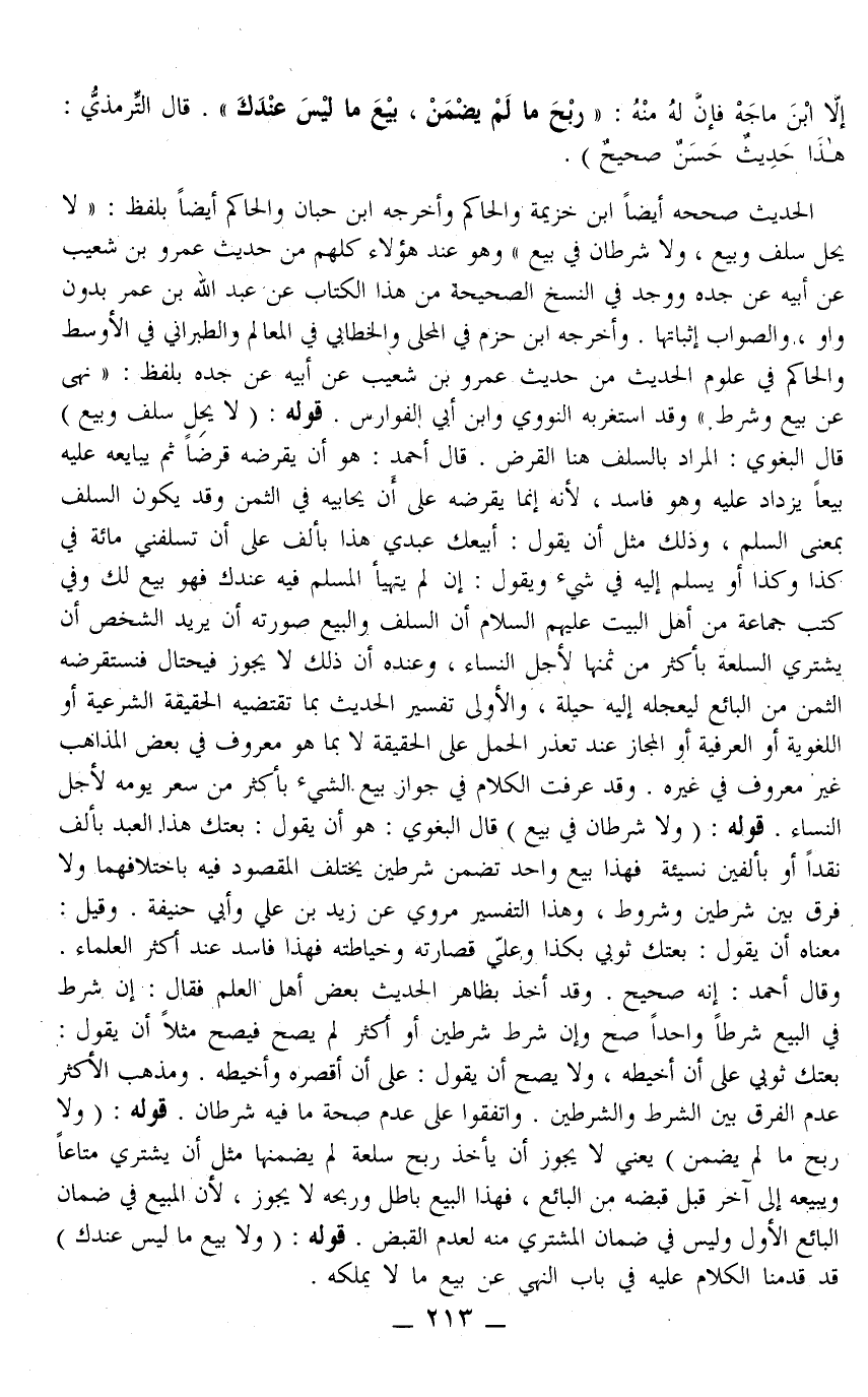 الْحَدِيثُ صَحَّحَهُ أَيْضًا ابْنُ خُزَيْمَةَ وَالْحَاكِمُ وَأَخْرَجَهُ ابْنُ حِبَّانَ وَالْحَاكِمُ أَيْضًا بِلَفْظِ: «لَا يَحِلُّ سَلَفٌ وَبَيْعٌ، وَلَا شَرْطَانِ فِي بَيْعٍ» ، وَهُوَ عِنْدَ هَؤُلَاءِ كُلِّهِمْ مِنْ حَدِيثِ عَمْرِو بْنِ شُعَيْبٍ عَنْ أَبِيهِ عَنْ جَدِّهِ وَوُجِدَ فِي النُّسَخِ الصَّحِيحَةِ مِنْ هَذَا الْكِتَابِ عَنْ عَبْدِ اللَّهِ بْنِ عُمَرَ بِدُونِ وَاوٍ وَالصَّوَابُ إثْبَاتُهَا، وَأَخْرَجَهُ ابْنُ حَزْمٍ فِي الْمُحَلَّى وَالْخَطَّابِيُّ فِي الْمَعَالِمِ وَالطَّبَرَانِيُّ فِي الْأَوْسَطِ وَالْحَاكِمُ فِي عُلُومِ الْحَدِيثِ مِنْ حَدِيثِ عَمْرِو بْنِ شُعَيْبٍ عَنْ أَبِيهِ عَنْ جَدِّهِ بِلَفْظِ: «نَهَى عَنْ بَيْعٍ وَشَرْطٍ.» وَقَدْ اسْتَغْرَبَهُ النَّوَوِيُّ وَابْنُ أَبِي الْفَوَارِسِ