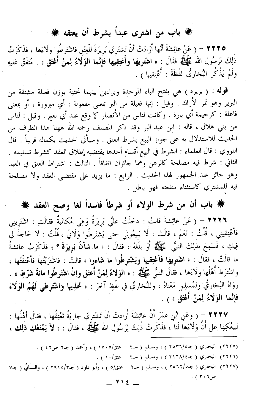 2226 - (عَنْ عَائِشَةَ قَالَتْ: «دَخَلَتْ عَلَيَّ بَرِيرَةُ وَهِيَ مُكَاتَبَةٌ فَقَالَتْ: اشْتَرِينِي فَأَعْتِقِينِي، قُلْت: نَعَمْ، قَالَتْ: لَا يَبِيعُونِي حَتَّى يَشْتَرِطُوا وَلَائِي، قُلْت: لَا حَاجَةَ لِي فِيكِ، فَسَمِعَ بِذَلِكَ النَّبِيُّ - صَلَّى اللَّهُ عَلَيْهِ وَسَلَّمَ - أَوْ بَلَغَهُ، فَقَالَ: مَا شَأْنُ بَرِيرَةَ؟ فَذَكَرَتْ عَائِشَةُ مَا قَالَتْ، فَقَالَ: اشْتَرِيهَا فَأَعْتِقِيهَا وَيَشْتَرِطُوا مَا شَاءُوا قَالَتْ: فَاشْتَرَيْتُهَا فَأَعْتَقْتُهَا، وَاشْتَرَطَ أَهْلُهَا وَلَاءَهَا، فَقَالَ النَّبِيُّ - صَلَّى اللَّهُ عَلَيْهِ وَسَلَّمَ -: الْوَلَاءُ لِمَنْ أَعْتَقَ وَإِنْ اشْتَرَطُوا مِائَةَ شَرْطٍ» رَوَاهُ الْبُخَارِيُّ وَلِمُسْلِمٍ مَعْنَاهُ، وَلِلْبُخَارِيِّ فِي لَفْظٍ آخَرَ: «خُذِيهَا وَاشْتَرِطِي لَهُمْ الْوَلَاءَ فَإِنَّمَا الْوَلَاءُ لِمَنْ أَعْتَقَ» .
