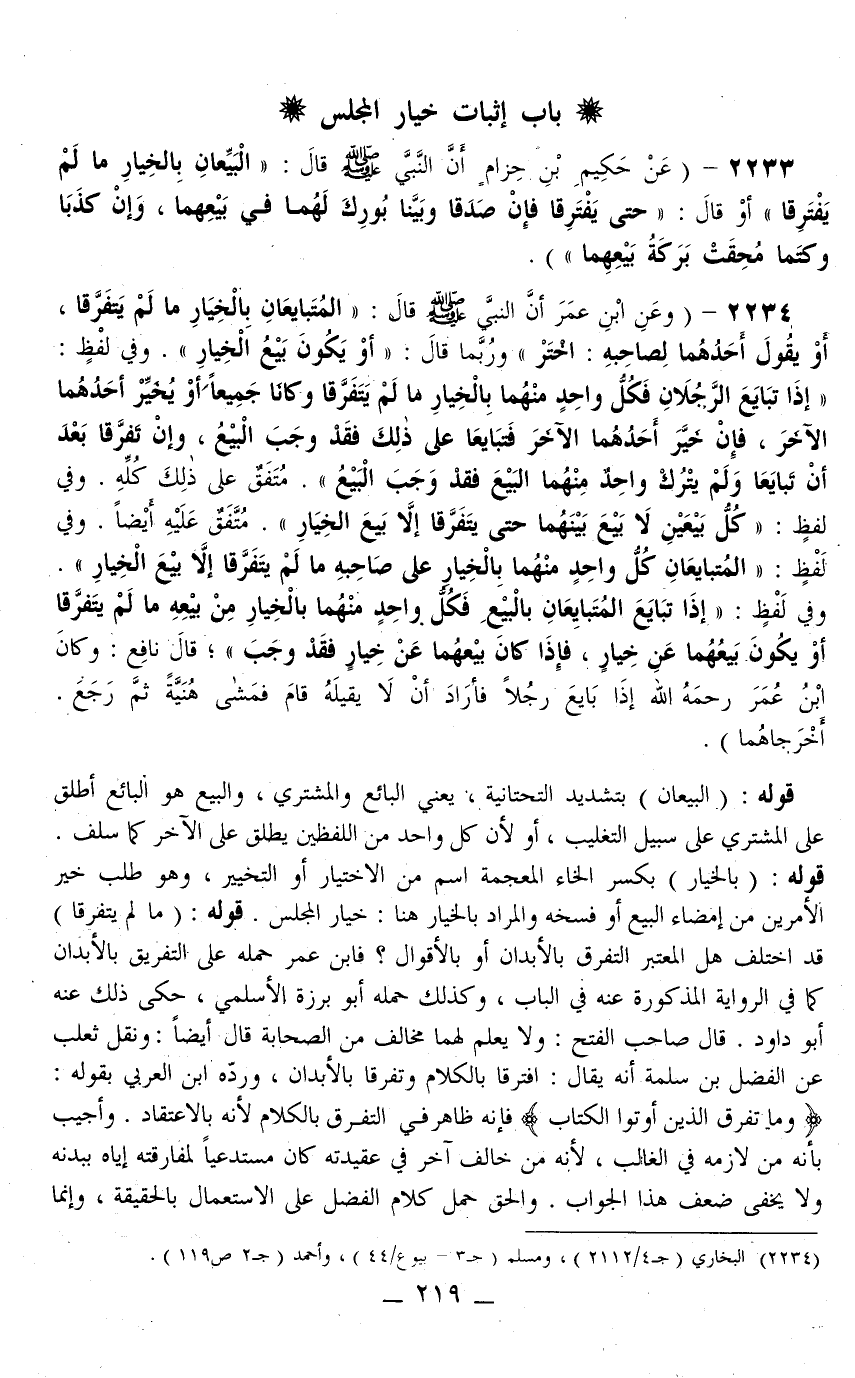 2234 - (وَعَنْ ابْنِ عُمَرَ أَنَّ النَّبِيَّ - صَلَّى اللَّهُ عَلَيْهِ وَسَلَّمَ - قَالَ: «الْمُتَبَايِعَانِ بِالْخِيَارِ مَا لَمْ يَتَفَرَّقَا، أَوْ يَقُولَ أَحَدُهُمَا لِصَاحِبِهِ: اخْتَرْ وَرُبَّمَا قَالَ: أَوْ يَكُونُ بَيْعُ الْخِيَارِ» وَفِي لَفْظٍ: «إذَا تَبَايَعَ الرَّجُلَانِ فَكُلُّ وَاحِدٍ مِنْهُمَا بِالْخِيَارِ مَا لَمْ يَتَفَرَّقَا وَكَانَا جَمِيعًا أَوْ يُخَيِّرْ أَحَدُهُمَا الْآخَرَ، فَإِنْ خَيَّرَ أَحَدُهُمَا الْآخَرَ فَتَبَايَعَا عَلَى ذَلِكَ فَقَدْ وَجَبَ الْبَيْعُ، وَإِنْ تَفَرَّقَا بَعْدَ أَنْ تَبَايَعَا وَلَمْ يَتْرُكْ وَاحِدٌ مِنْهُمَا الْبَيْعَ فَقَدْ وَجَبَ الْبَيْعُ.» مُتَّفَقٌ عَلَى ذَلِكَ كُلِّهِ، وَفِي لَفْظٍ: «كُلُّ بَيِّعَيْنِ لَا بَيْعَ بَيْنَهُمَا حَتَّى يَتَفَرَّقَا إلَّا بَيْعَ الْخِيَارِ» مُتَّفَقٌ عَلَيْهِ أَيْضًا وَفِي لَفْظٍ: «الْمُتَبَايِعَانِ كُلُّ وَاحِدٍ مِنْهُمَا بِالْخِيَارِ عَلَى صَاحِبِهِ مَا لَمْ يَتَفَرَّقَا إلَّا بَيْعَ الْخِيَارِ» وَفِي لَفْظٍ «إذَا تَبَايَعَ الْمُتَبَايِعَانِ بِالْبَيْعِ فَكُلُّ وَاحِدٍ مِنْهُمَا بِالْخِيَارِ مِنْ بَيْعِهِ مَا لَمْ يَتَفَرَّقَا، أَوْ يَكُونُ بَيْعُهُمَا عَنْ خِيَارٍ، فَإِذَا كَانَ بَيْعُهُمَا عَنْ خِيَارٍ فَقَدْ وَجَبَ» قَالَ نَافِعٌ: وَكَانَ ابْنُ عُمَرَ - رَحِمَهُ اللَّهُ - إذَا بَايَعَ رَجُلًا فَأَرَادَ أَنْ لَا يُقِيلَهُ قَامَ فَمَشَى هُنَيَّة ثُمَّ رَجَعَ أَخْرَجَاهُمَا)
