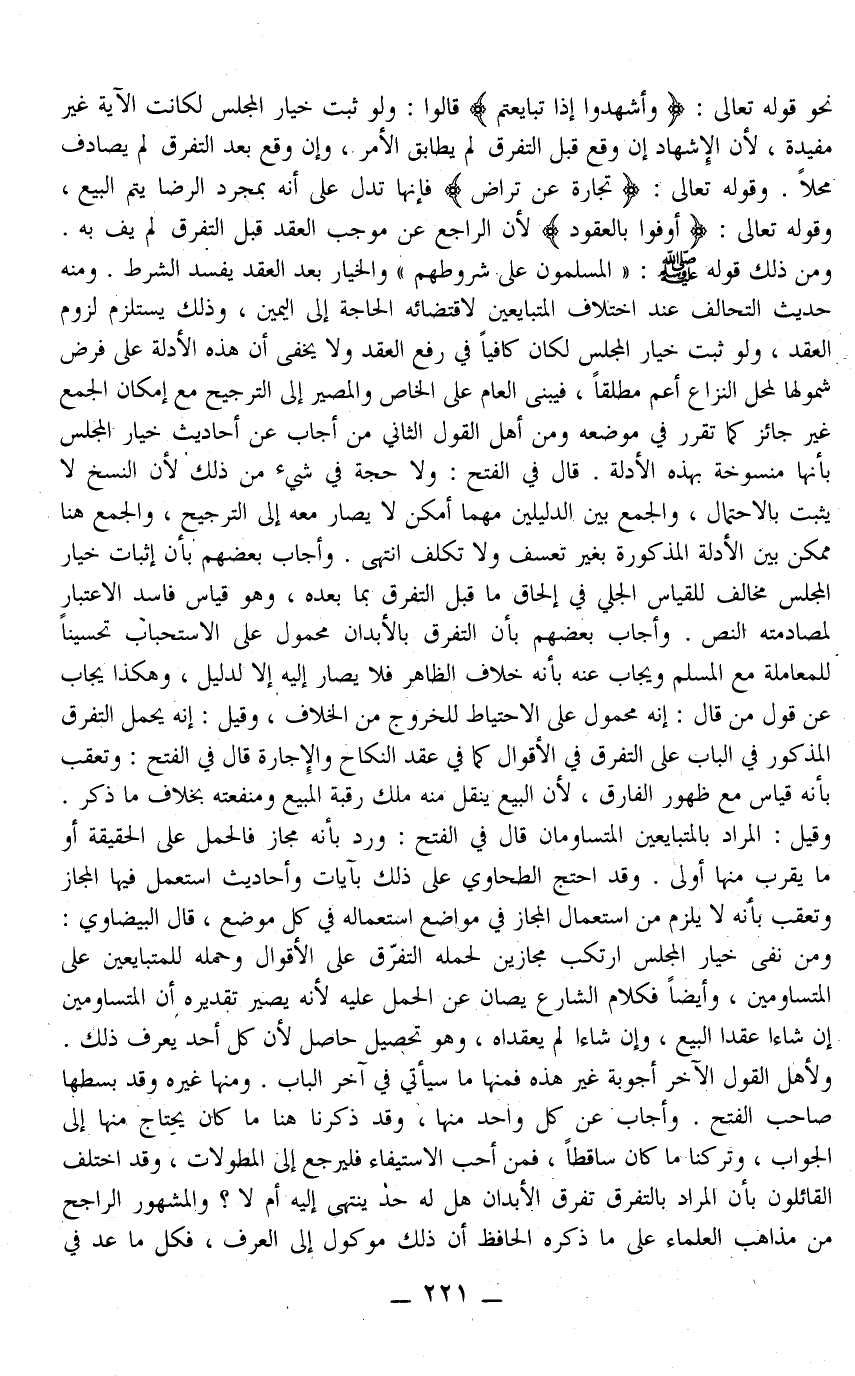 ـــــــــــــــــــــــــــــQنَحْوَ قَوْله تَعَالَى: {وَأَشْهِدُوا إِذَا تَبَايَعْتُمْ} [البقرة: 282] قَالُوا: وَلَوْ ثَبَتَ خِيَارُ الْمَجْلِسِ لَكَانَتْ الْآيَةُ غَيْرَ مُفِيدَةٍ؛ لِأَنَّ الْإِشْهَادَ إنْ وَقَعَ قَبْلَ التَّفَرُّقِ لَمْ يُطَابِقْ الْأَمْرَ، وَإِنْ وَقَعَ بَعْدَ التَّفَرُّقِ لَمْ يُصَادِفْ مَحَلًّا، وقَوْله تَعَالَى: {تِجَارَةً عَنْ تَرَاضٍ} [النساء: 29] فَإِنَّهَا تَدُلُّ عَلَى أَنَّهُ بِمُجَرَّدِ الرِّضَا يَتِمُّ الْبَيْعُ، وقَوْله تَعَالَى: {أَوْفُوا بِالْعُقُودِ} [المائدة: 1] لِأَنَّ الرَّاجِعَ عَنْ مُوجِبِ الْعَقْدِ قَبْلَ التَّفَرُّقِ لَمْ يَفِ بِهِ، وَمِنْ ذَلِكَ قَوْلُهُ - صَلَّى اللَّهُ عَلَيْهِ وَسَلَّمَ - «الْمُسْلِمُونَ عَلَى شُرُوطِهِمْ» وَالْخِيَارُ بَعْدَ الْعَقْدِ يُفْسِدُ الشَّرْطَ.