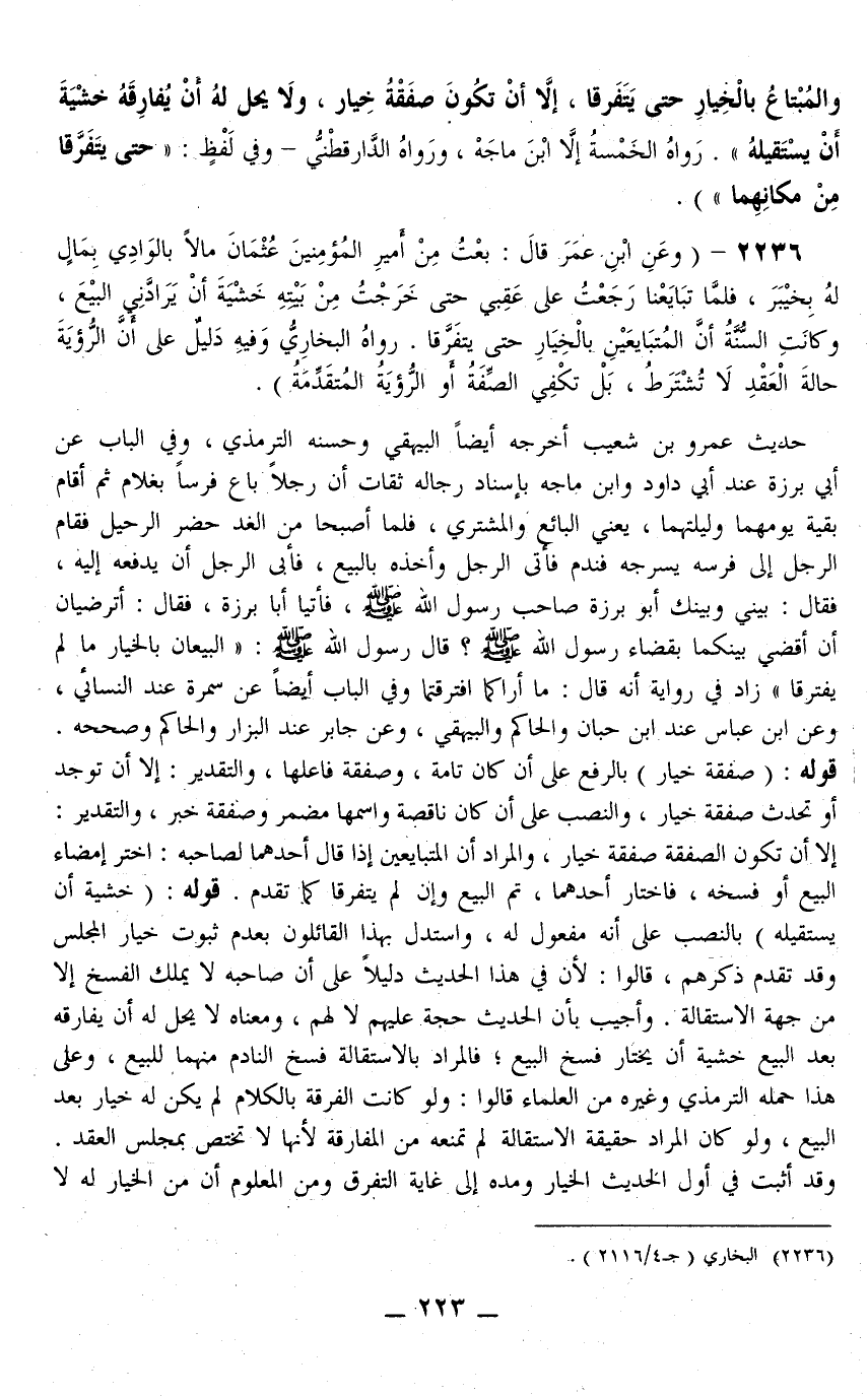 2236 - (وَعَنْ ابْنِ عُمَرَ قَالَ: «بِعْتُ مِنْ أَمِيرِ الْمُؤْمِنِينَ عُثْمَانَ مَالًا بِالْوَادِي بِمَالٍ لَهُ بِخَيْبَرَ، فَلَمَّا تَبَايَعْنَا رَجَعْتُ عَلَى عَقِبِي حَتَّى خَرَجْتُ مِنْ بَيْتِهِ خَشْيَةَ أَنْ يُرَادَّنِي الْبَيْعَ، وَكَانَتْ السُّنَّةُ أَنَّ الْمُتَبَايِعَيْنِ بِالْخِيَارِ حَتَّى يَتَفَرَّقَا» رَوَاهُ الْبُخَارِيُّ وَفِيهِ دَلِيلٌ عَلَى أَنَّ الرُّؤْيَةَ حَالَةَ الْعَقْدِ لَا تُشْتَرَطُ، بَلْ تَكْفِي الصِّفَةُ أَوْ الرُّؤْيَةُ الْمُتَقَدِّمَةُ) .
